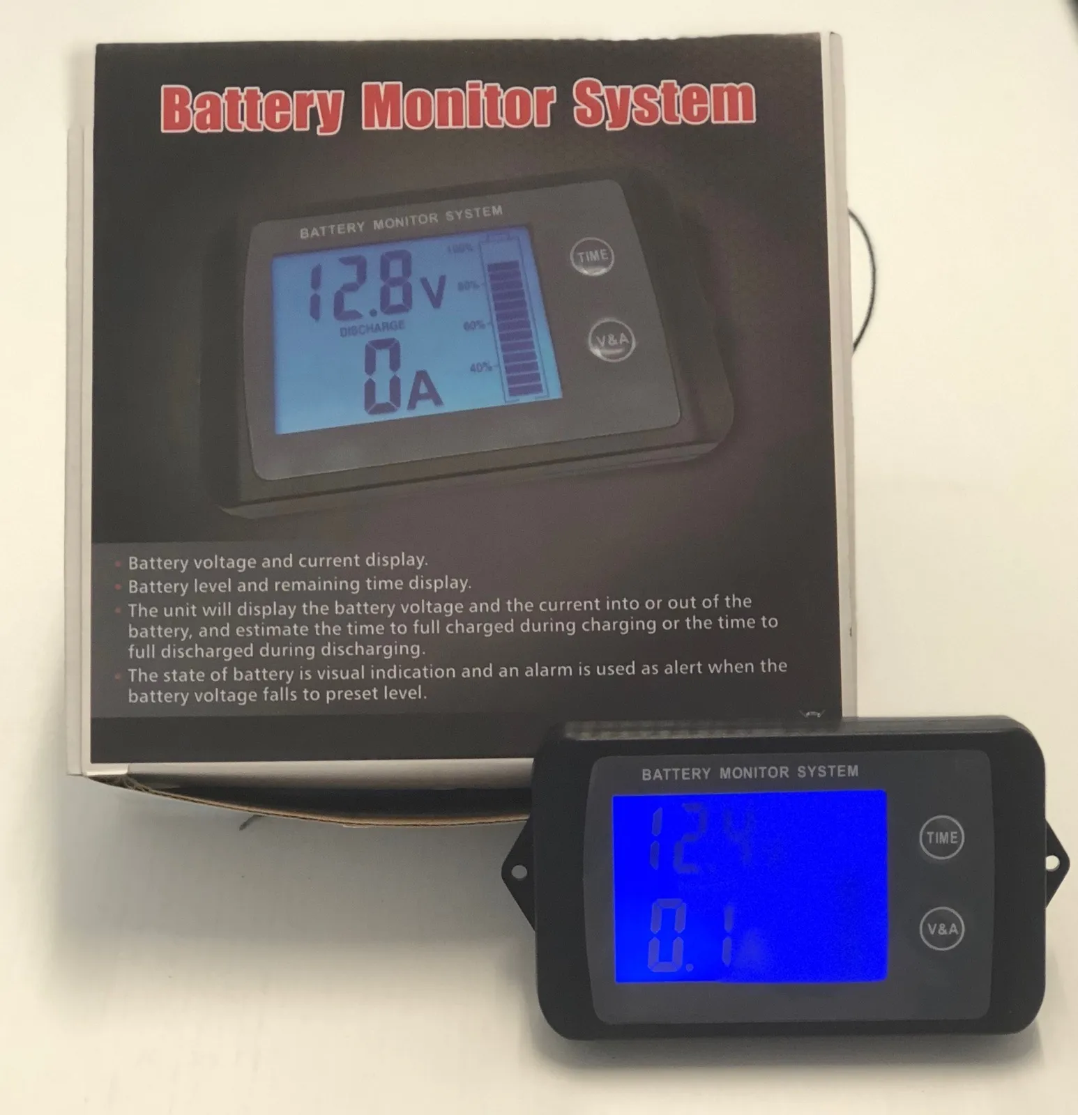 The unit monitors the battery voltage, current into and out of the battery and estimates the time to fully charged during charging or the time to full discharge during discharging.   The state of the battery is a visual indication and an alarm is used as alert when the battery voltage falls to a pre-set level.