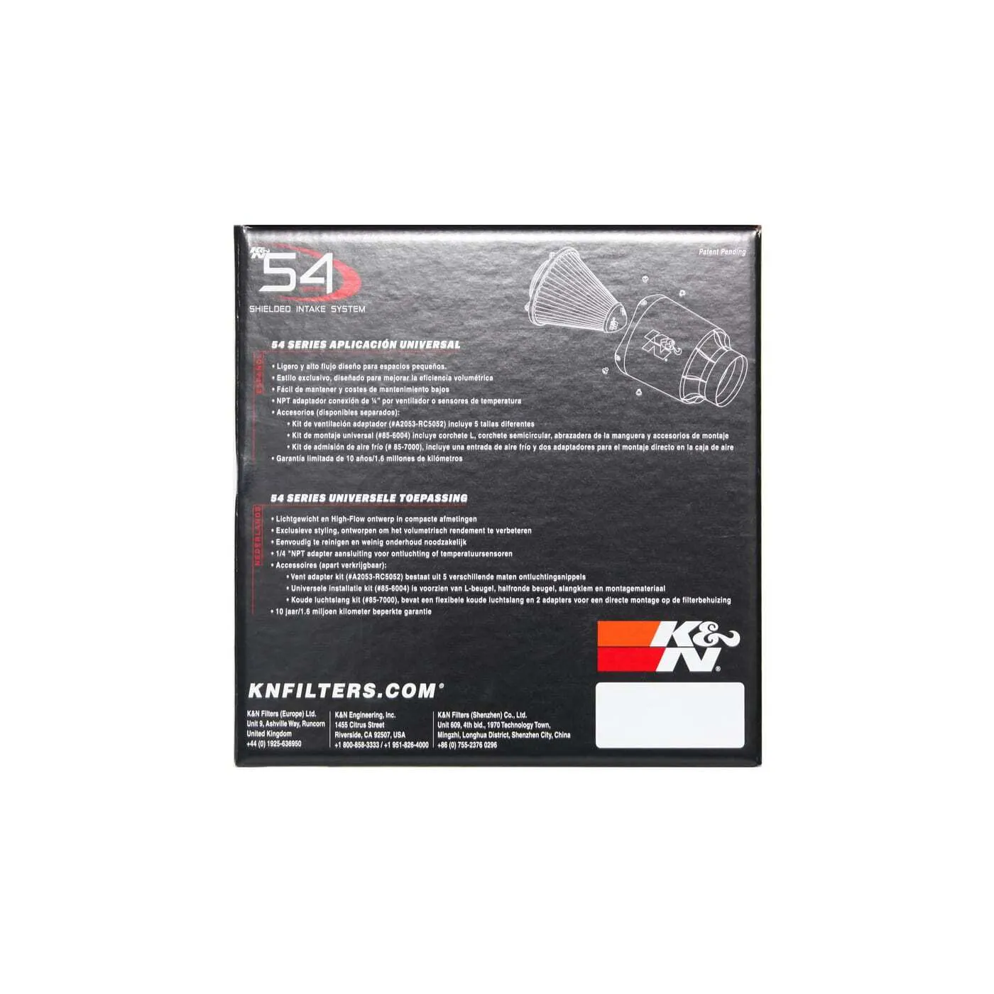 K&N’s 54 Series shielded air intake system is a universal cold air intake system. The 54 Series assembly is designed to increase volumetric efficiency and engine horsepower. The intake incorporates a K&N famous cotton gauze air filter which is removable for periodic cleaning and provides the benefit of an open cone filter and standard air box in one unit. The plastic injection-molded housing acts as a heat shield to prevent any power loss. Assembly designs were flow tested for many hours before our engineers completed the shape to provide high flow with low restriction and great filtration all in a small space. Included in the box is a template to cut your own vinyl wrap for personal customization of the housing. The assembly comes with a 76mm air filter base flange and a 100mm housing intake diameter. The filter base incorporates a 1/4 inch NPT threaded fitting to attach an optional vent adapter.