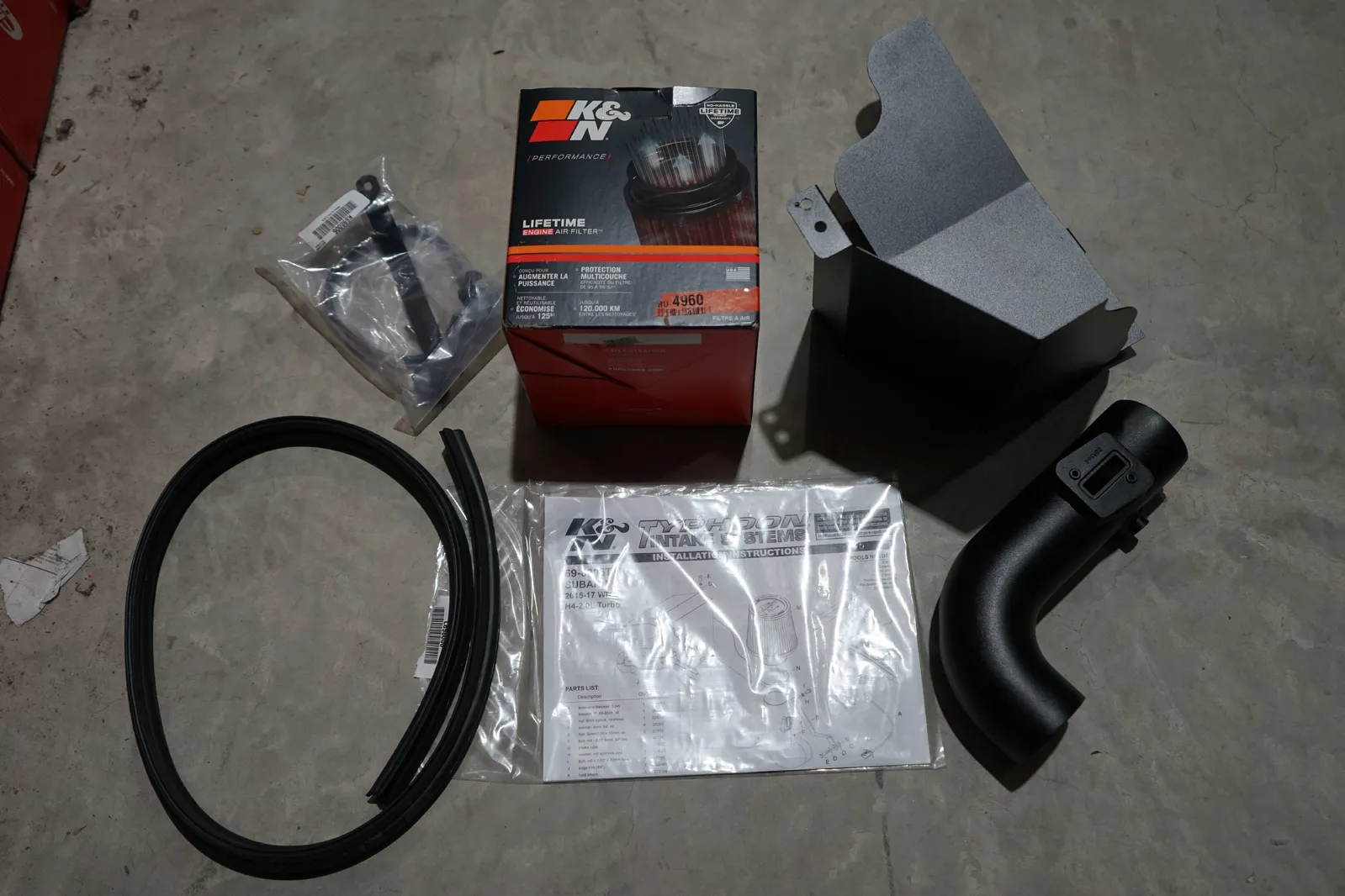 The K&N 69-8006TTK Typhoon air intake system is a free-flowing, mandrel-bent aluminum tube air induction system designed to fit some Subaru WRX Turbo models. The restrictive factory air filter and air intake housing are replaced by the K&N Typhoon air intake which is designed to dramatically reduce air flow restriction as it smoothes and straightens air flow. This allows your engine to inhale a larger amount of air than the factory air intake. More air means more usable power and acceleration throughout the engine's RPM range. In addition to more power, this air intake system improves engine sound with more aggressive and deeper acoustics during acceleration. The 69-8006TTK air intake comes with a black rubber topped K&N high-flow air filter and a heat shield that installs into the original air box space. Air is directed through the intake tube into the engine's turbo inlet for a guaranteed power gain. The intake tube has an attractive textured black powder-coated finish that's made to last and it accommodates the factory mass air sensor. The oversized cone shaped air filter can be used for up to 100,000 miles before servicing is needed depending on driving conditions. This air intake is relatively easy to install usually in 90 minutes or less using existing factory mounting points. The tools needed are a couple of screwdrivers, a ratchet set and some wrenches. Some Typhoon air intakes are not legal for sale or use in California and other states adopting California emission standards while others are CARB exempt and 50 state legal. Check the K&N catalog or website for vehicle applications and specific CARB status for each vehicle and air intake.
