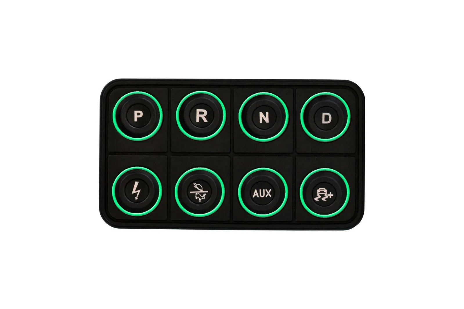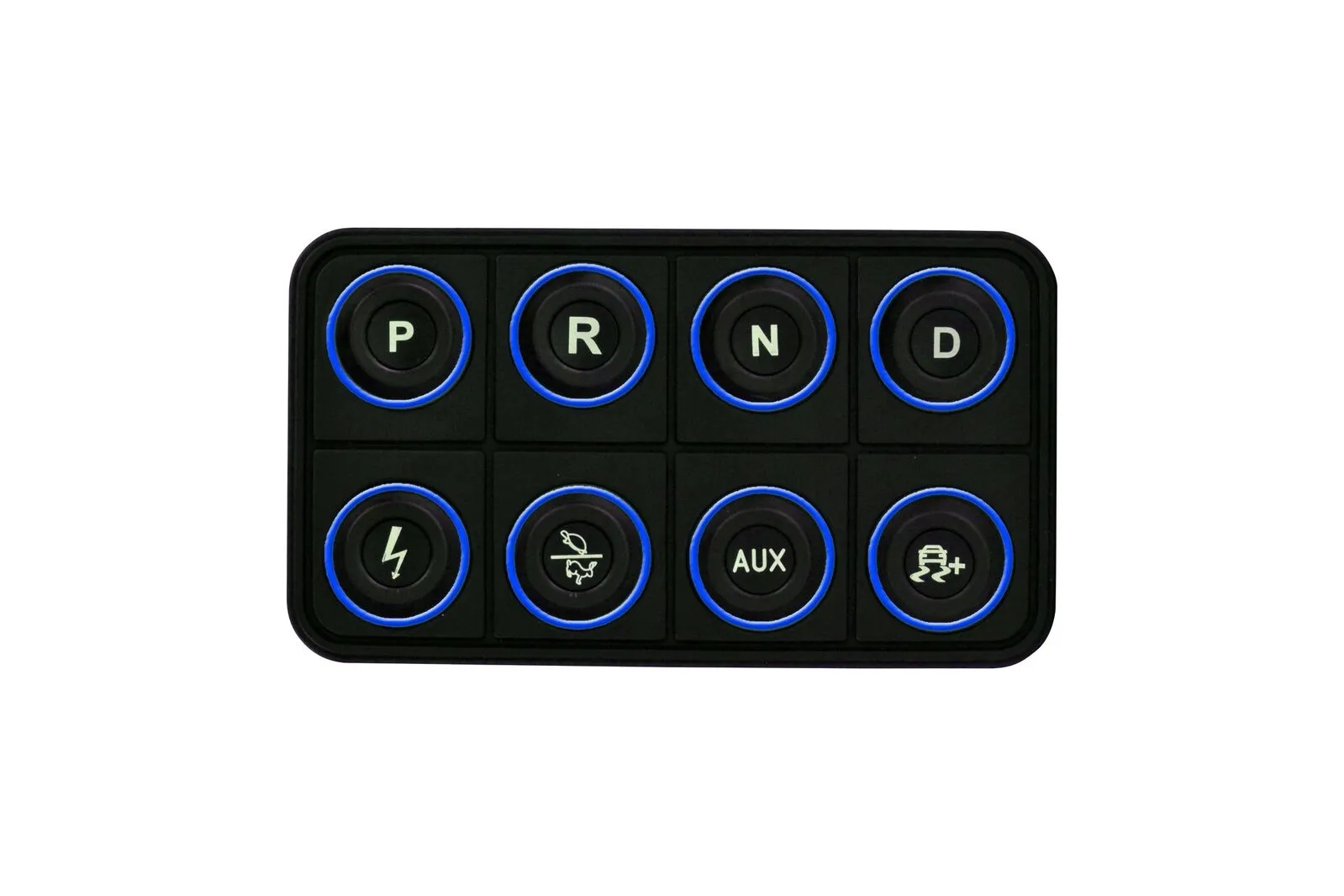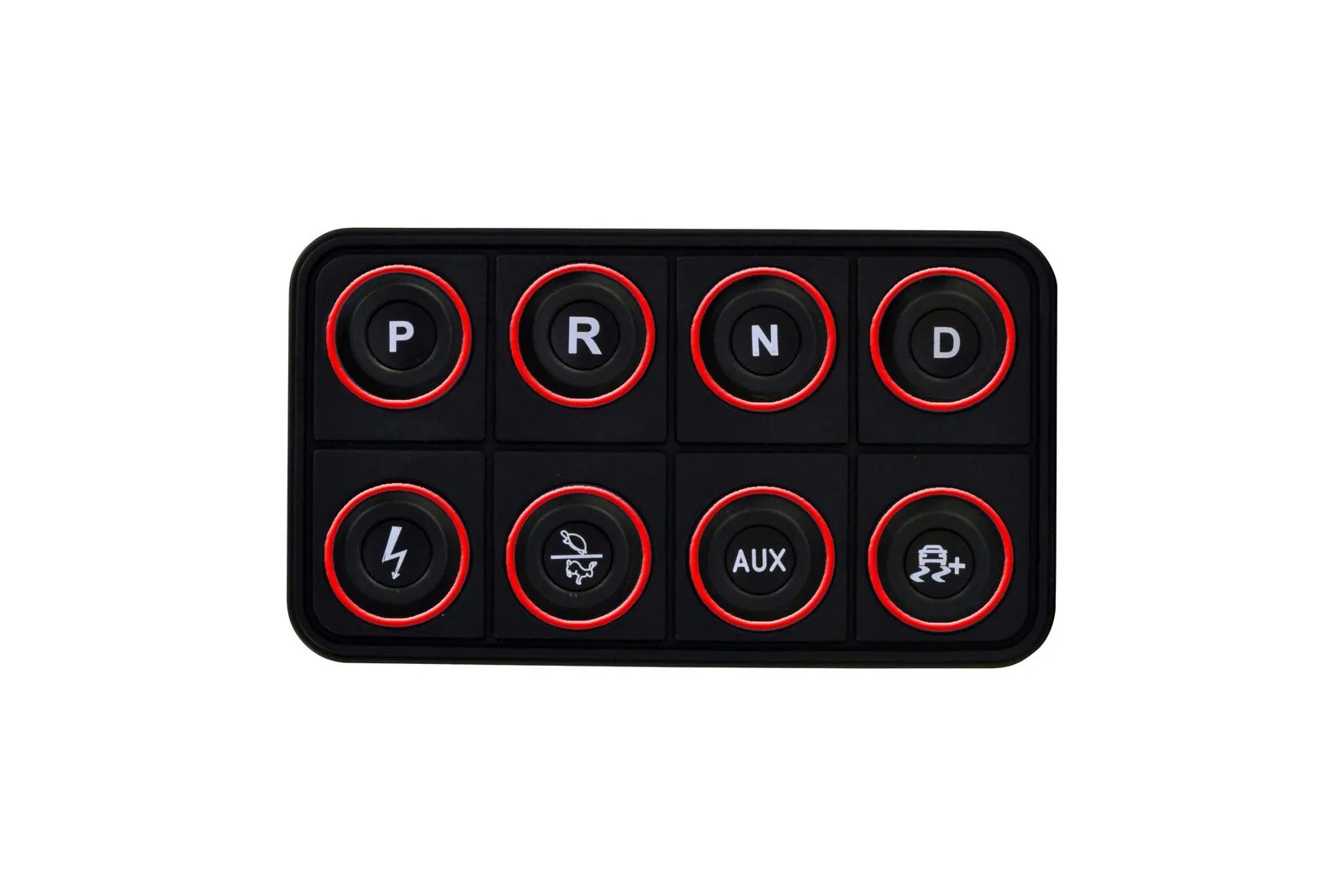 The VCU200 supports direct-drive only, and the button functions are fixed. The top row of buttons control P, R, N, and D, and the bottom row buttons control ignition, performance level, auxiliary control for a dedicated 20 Amp PDU output, and traction control slip target (coming soon).