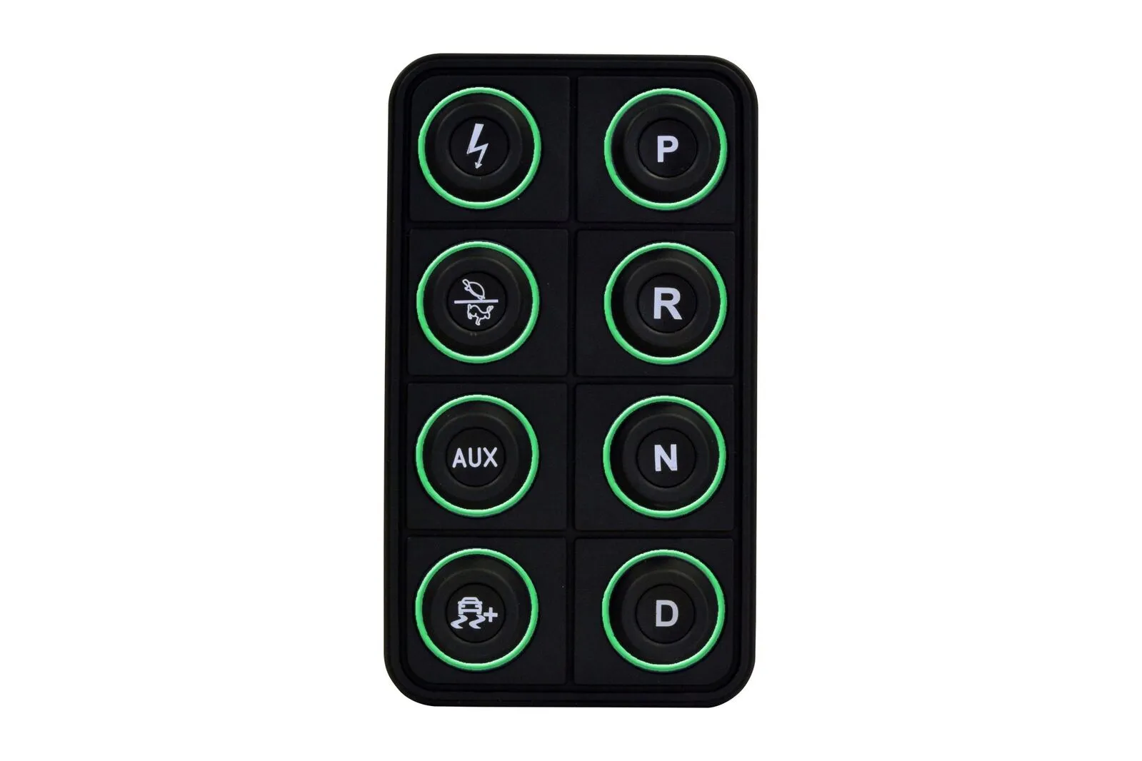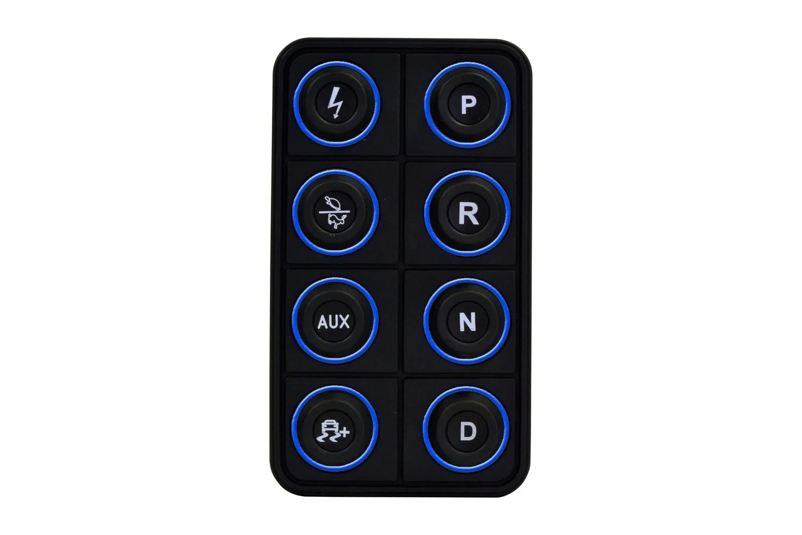 The AEM EV 8-Button CAN Keypad (PN 30-8400) puts control at your fingertips in EV street-conversion and motorsports vehicles. It is a VCU expansion device that allows you to control vehicle functions by programming them in the VCU software, and then send these commands via CAN bus to a VCU200 or VCU300 Vehicle Control Unit. Functions like Ignition, Park, Reverse, Neutral and Drive, as well as two map switching functions like performance level and traction control, are all controlled from a central location through a sleek, vibrant interface.