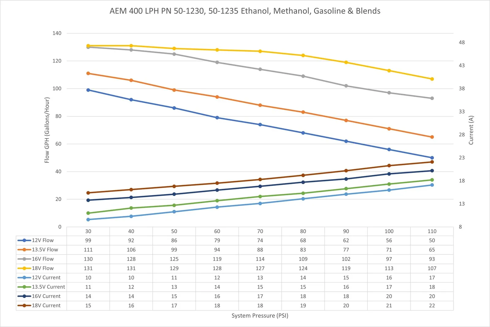 AEM's 400LPH high flow fuel pumps were designed with high performance naturally aspirated and forced induction EFI vehicles in mind! They deliver the same high flow and reliable performance that AEM has become known for at very competitive price. Each pump is individually flow tested and guaranteed to flow 400+ LPH (106 GPH) at 40 PSI (13.5V), which on gasoline will support 1000+ horsepower!* The pumps also maintain their high flowrate even as system pressure increases flowing 330+ LPH at 70 PSI (13.5V) which will support approx. 870 HP* on gasoline! Please see the flow curves and current draw vs. fuel pressure graphs on the specs tab for more information. With their compact 39mm body (same size as Walbro 255), low amperage draw, 11mm inlets and 9mm barbed outlet's these fuel pumps were designed to replace the OEM fuel pump in many applications. The 50-1230 features a double barbed outlet that is ideal for 3/8-inch ID hose where the 50-1235 features a smooth barbed outlet that is compatible with 5/16-inch ID hose. Each pump includes a wiring harness, pre filter, internal fuel hose and clamps, end cap and rubber buffer sleeve. Note: Your vehicle's factory fuel pump wiring may not be adequate to handle the current draw of AEM's High Flow Fuel Pumps. Please refer to the Electrical Requirements section in the instructions document for proper wiring. Note: These pumps do not include integrated check valves.