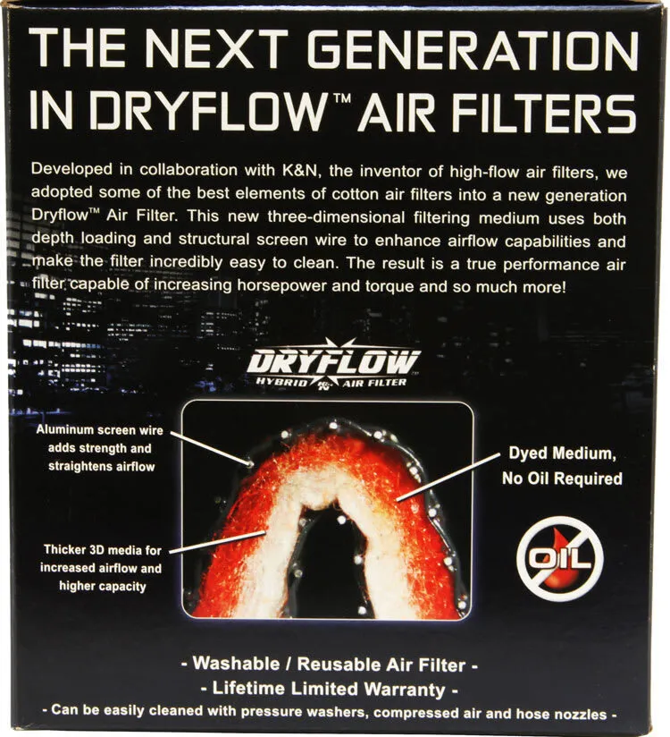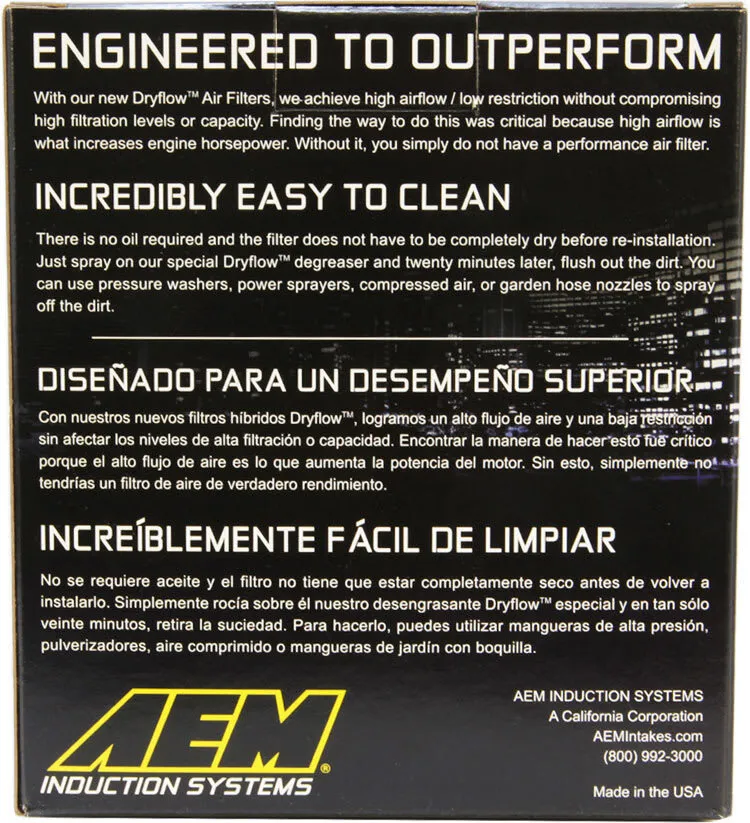 AEM Dryflow Air Filters are washable synthetic air filters designed for an optimum combination of air flow, filtration, and performance. AEM Dryflow filters use an innovative high performance oil-free filtration material that allows easy cleaning, durable service, and excellent filtration.