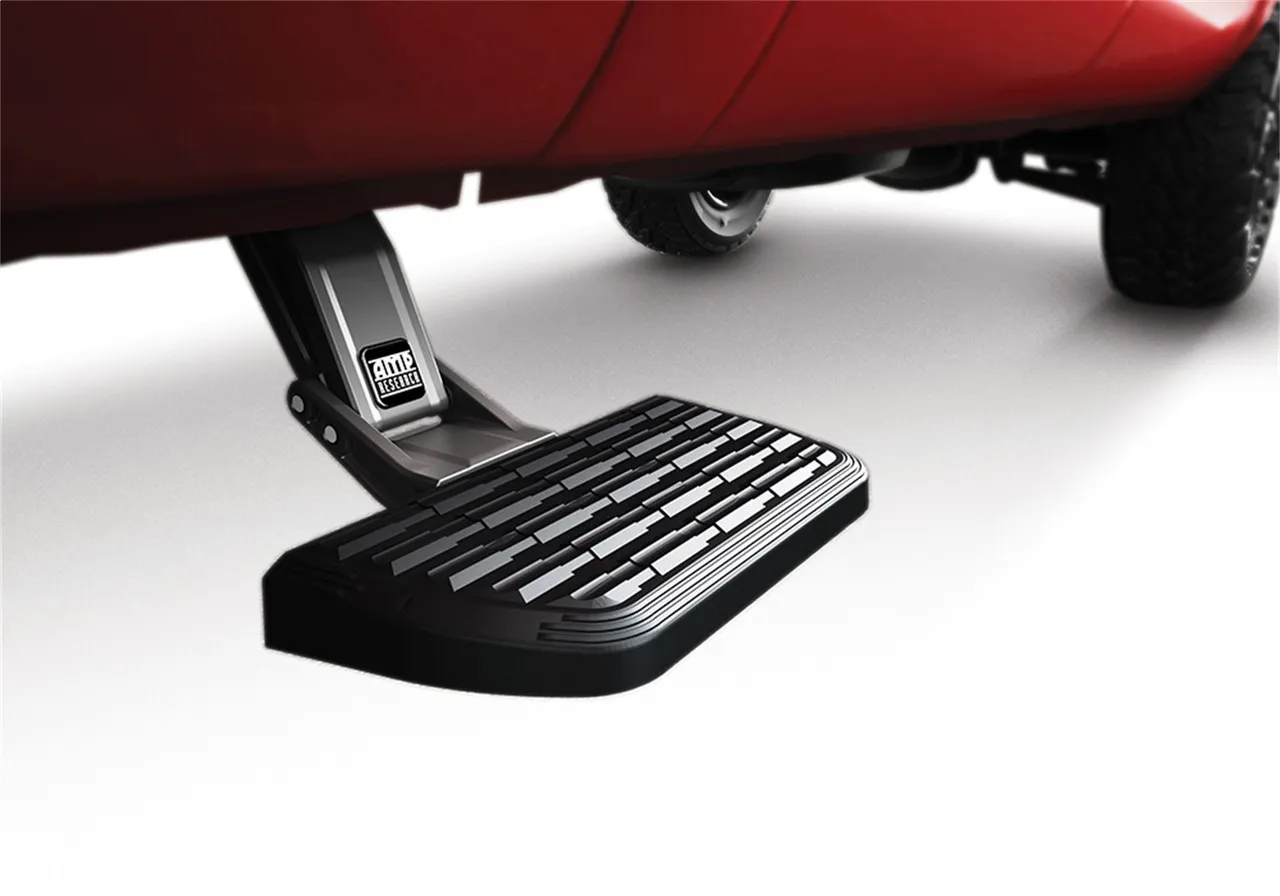 Side steps for hard-working trucks. The AMP Research Bedstep2 mounts just behind the cab, forward of the rear wheel, providing a faster, easier and safer route to access toolboxes, equipment and cargo in the bed. Easily installed, this frame-mounted, retractable truck step can be mounted on either side of the truck box, and it flips down or retracts with just the nudge of your foot.