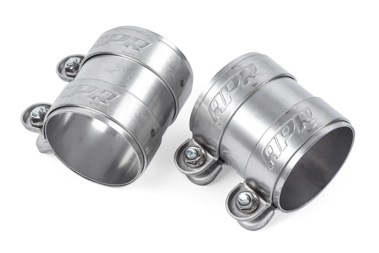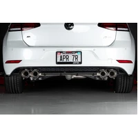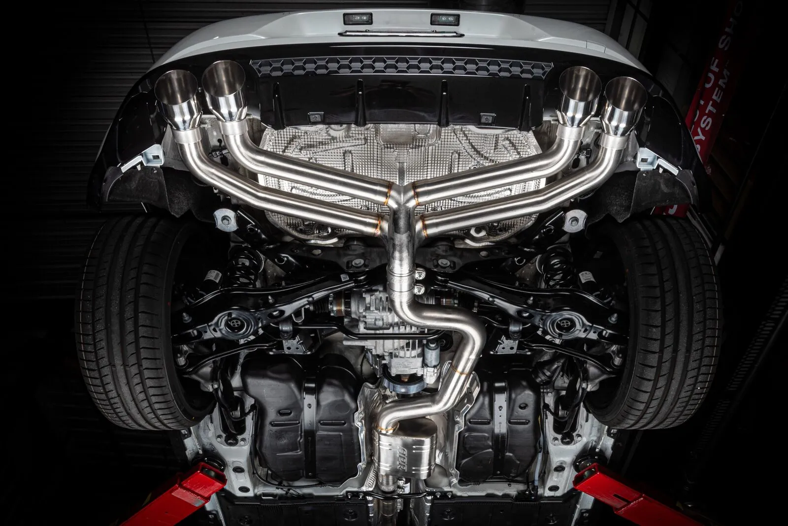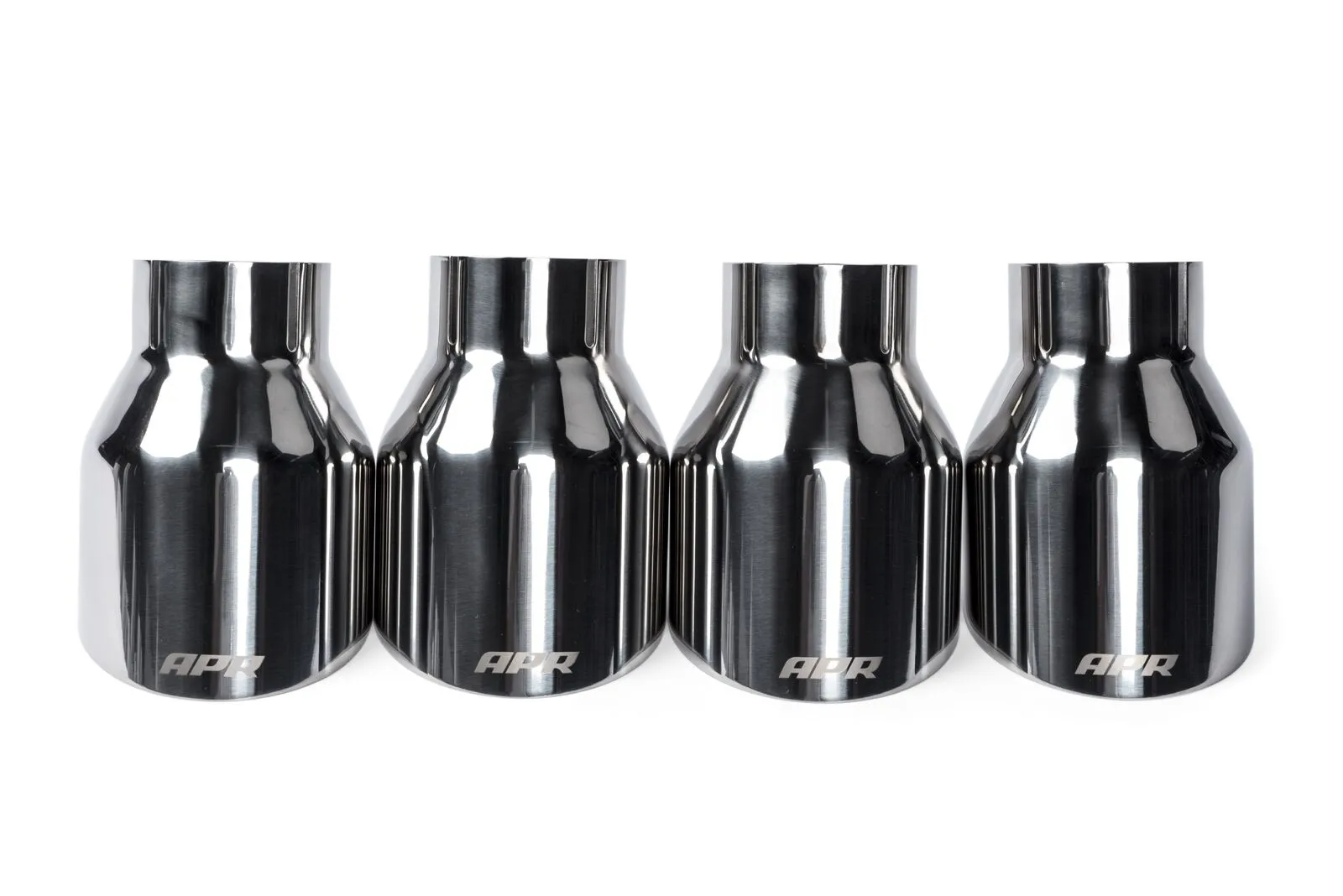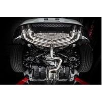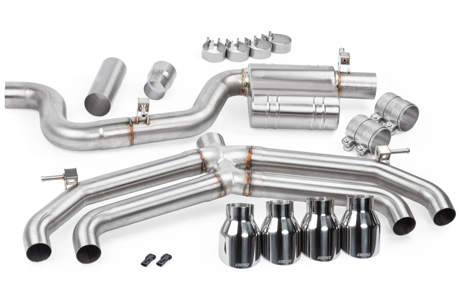 The APR Catback Exhaust System personalizes your vehicle's looks, sound and performance. Beautifully hand-crafted T304-stainless-steel components adorn the system with stunning TIG-welding throughout. Our straight-through brushed-finished stainless-steel piping give the exhaust note an aggressive growl without any restrictions, while our Helmholtz resonator reduces unwanted frequencies. Strong high-quality bracketry and OEM-style clamps hold the system steadily in place, making the install or removal a snap, and fitment simple, yet precise. A cast 3" to quad 2.5" rear splitter creates an ultra-smooth transition, steadily feeding exhaust gasses out of the system, while looking tidy from under the rear bumper. Lastly removable 4" polished slash-cut exhaust tips finish the system, adding a classy motorsport-inspired touch to the rear of the vehicle.