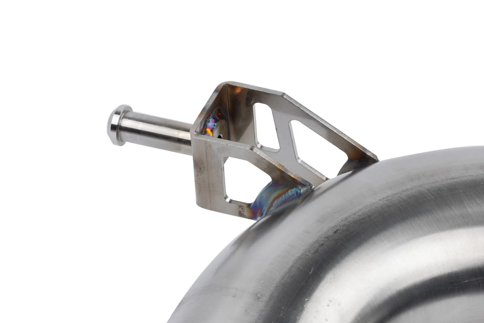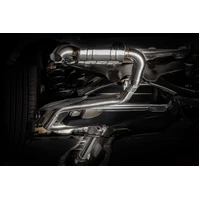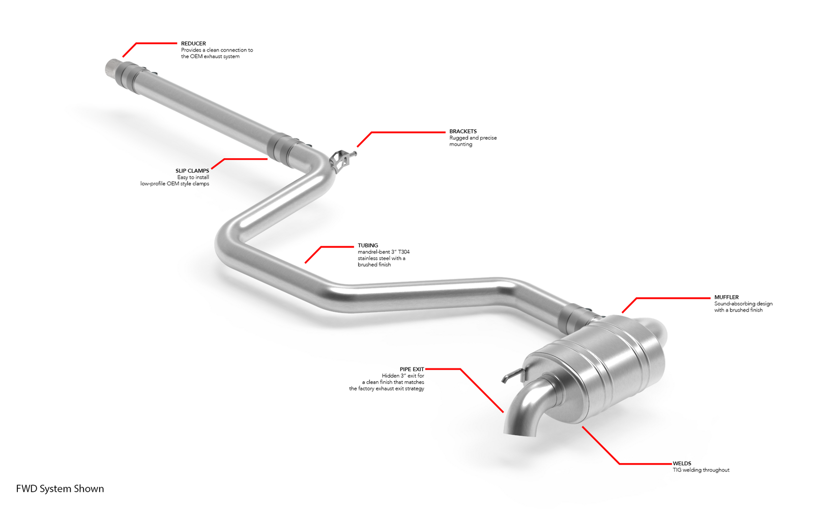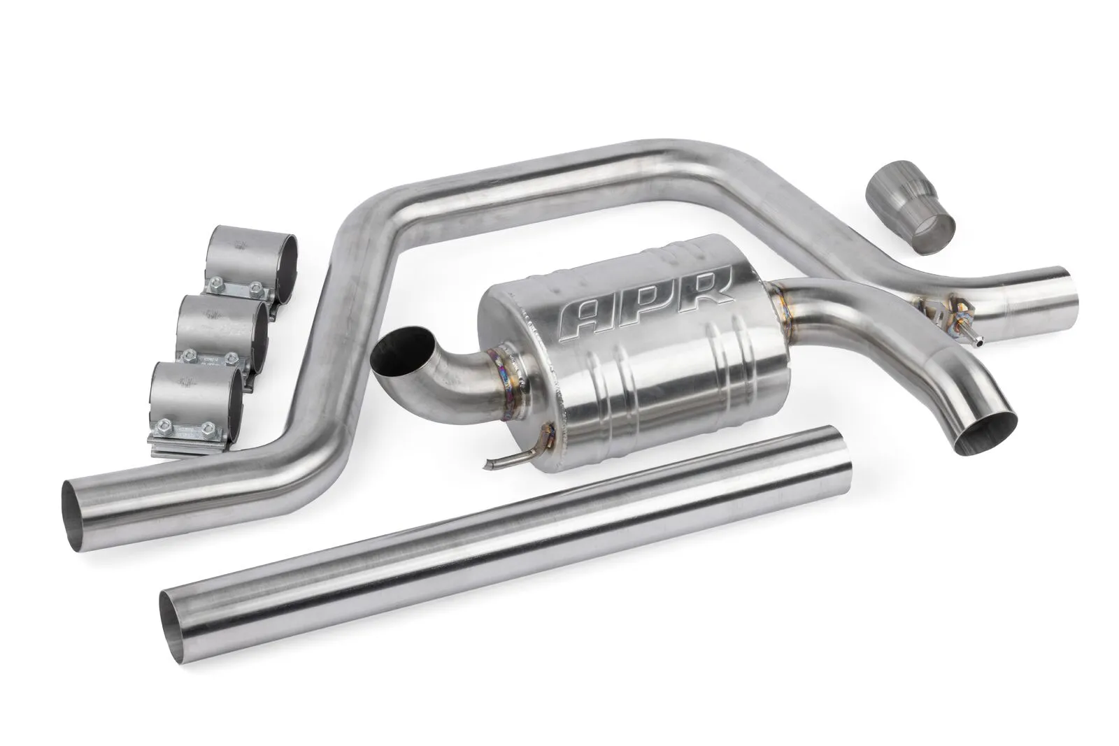 The APR Catback Exhaust System personalizes your vehicle's sound and performance. Beautifully hand-crafted T304-stainless-steel components adorn the system with stunning TIG-welding throughout. Our straight-through brushed-finished muffler smooths the exhaust note to a deep growl, without adding restrictions, rasp or drone. Strong high-quality bracketry and OEM-style clamps hold the system steadily in place, making the install or removal a snap, and fitment simple, yet precise. The full 3" tubing creates an ultra-smooth exhaust path, steadily feeding exhaust gasses out of the system, while looking tidy from under the rear bumper. Finally, the hidden 3" exhaust exit creates a clean finish that matches the factory exhaust exit strategy.