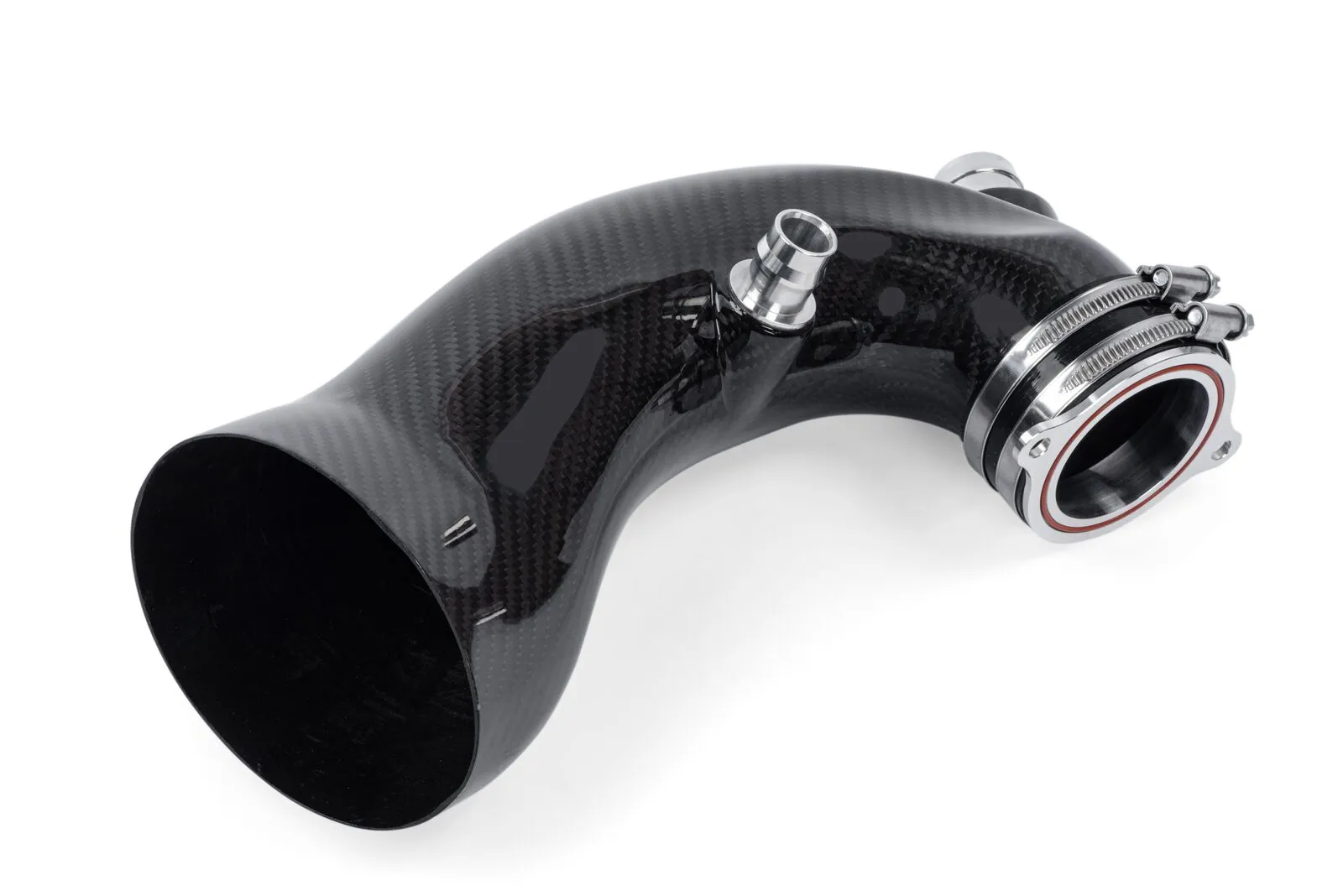 The factory turbocharger inlet pipe is a big restriction point because it's small. It's common for most intake systems to only focus on the filter and airbox, but doing so only has minimal impact on performance. Furthermore, upgrading the turbocharger inlet pipe only has minimal impact on performance if it still necks down to with the factory or aftermarket intake airbox. We solve this by making our pipe as large as possible from the 4" filter outlet all the way to the turbocharger inlet in one piece! This minimizes pressure drop and increases flow through the system far better than a multi-piece solutions.