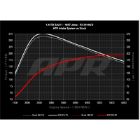 The factory intake system simply can't match the performance of our intake system. The factory frontal airbox only flows 509 CFM at 28" of H2O. We improved this by up to 44% with our open airbox across the testing range and hit a peak flow of 730 CFM by at the same depression! This directly translates to more power you can feel. Our 1.4T test vehicle saw an additional and 11 WFT-LBS of torque and 8 WHP compared to stock! These are solid gains that make a noticeable difference in performance!
