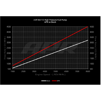 The volume of fuel the HPFP pump can displace is directly tied to the displacement of the pump (Internal bore size, and cam shaft dictated stroke), and engine speed. The pump is driven off of a three lobe cam shaft, and as such, the pump cycles at 1.5 times the engine speed. Even the factory K03 and K04 turbochargers are capable of taxing this system, especially in the mid to lower RPM range where fuel volume is lower.