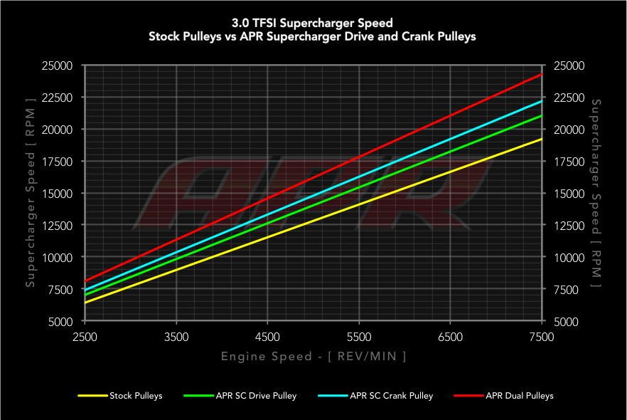 APR's Supercharger Drive and Crank Pulley Upgrades dramatically increase horsepower and torque by increasing the rotational speed of the factory supercharger. APR's Stage II Pulley ECU Upgrade makes the necessary engine management adjustments to handle the increased supercharger speeds, and in turn allows the engine to create more power. The pulleys are sold separately, allowing for multiple levels of performance, each of which builds upon the other. Finally, when combined with APR's Ultracharger Throttle Body Upgrade in a dual pulley setup, the system is alleviated of power robbing inlet restrictions, allowing the engine to achieve exciting new levels of performance!