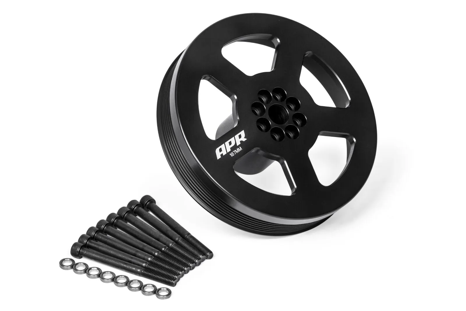 APR's Supercharger Crank Pulley Upgrade increases the diameter of the factory pulley from ~162mm to ~187mm, which in turn spins the supercharger ~15.4% faster. This results in a larger bump in horsepower and torque across the entire RPM range, as the supercharger is spinning at an even higher rate of speed. The pulley retains the factory harmonically balanced crank pulley and bolts on top of the existing unit. It is CNC machined from light weight billet aluminum with weight saving pockets throughout. It has an anodized black finish and includes new crank pulley bolts.