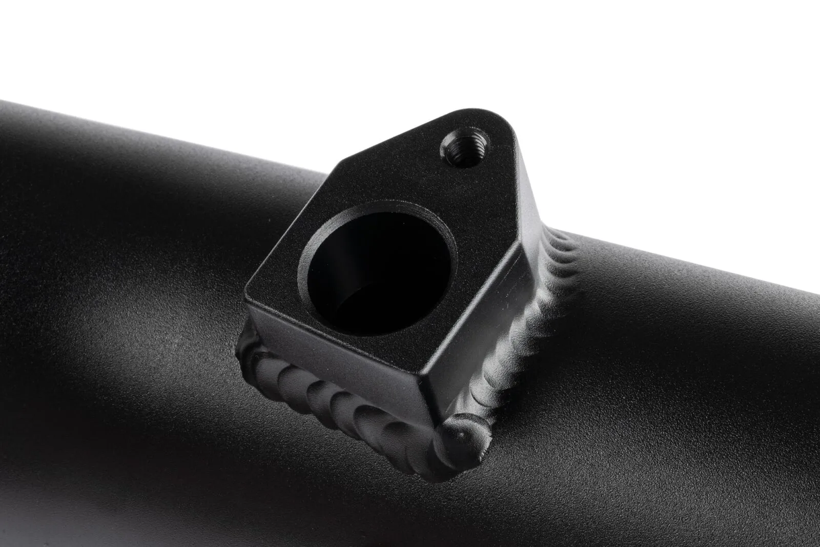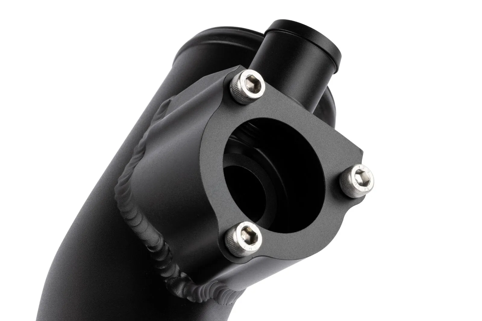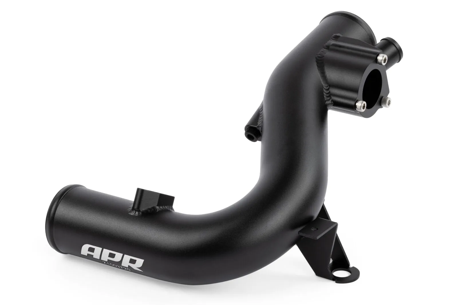 The APR Throttle Body Pipe replaces the factory plastic pipe with a high quality aluminum pipe that's a constant diameter within. We pay close attention to the airflow path and provide as few bends and tight radius turns as possible to maximize performance. Unlike the factory plastic pipes, ours won't melt and crack under extreme conditions, and ours don't contain a failure-prone and resistive internal piece like the factory pipe. The pipe features an additional port which can be used for an additional sensor, water/methanol injection, or however you see fit, and includes an NPT tap to block it off when not in use. The pipe features bead rolled connection points to help resist hose slippage, and all mounting brackets and billet sensor and DV recirculation ports are tig-welded to the pipe for a strong connection. Finally, the pipe is finished in an attractive satin-black finish. This all results in a more reliable setup and increased performance through a smooth and strong uninterrupted airflow path. This pipe is compatible with both OEM and upgraded APR charge hoses.