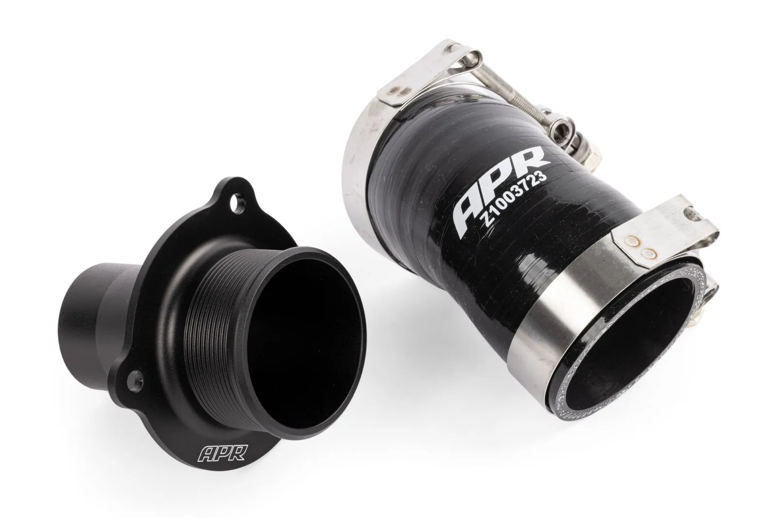 The APR Turbo Muffler Pipe and Turbo Outlet Hose takes a multiple step approach to upgraded these components which results in a much larger and smoother airflow path than simply upgrading each component on its own. The turbo muffler is designed to soften sound from the turbocharger, taking away the sounds enthusiasts enjoy. We do away with this and in doing so we eliminate a restriction path that causes turbulence and reduces performance. The outlet of the muffler pipe has a cross sectional area 66% larger than stock. By upgrading both the hose and muffler pipe at the same time, we're able to dramatically increase the size of the system to match the size of the other hoses and pipes in the charge air system, just like on the higher output Golf R / S3 Models. Unlike some components on the market, the APR system retains the critical PCV vent path on the muffler pipe for necessary for proper engine operation. Because a critical seal is not necessary due to the need for a PCV path, the muffler pipe is created from a solid piece of billet aluminum with a satin black finish and no need for extra gaskets.