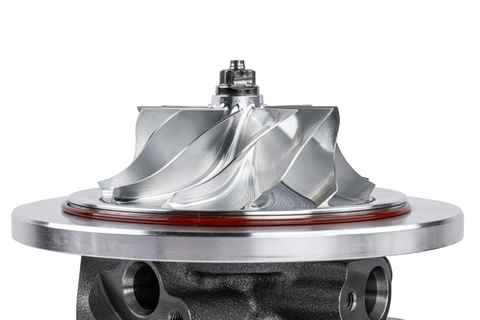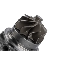 Since this turbo was designed from the ground up, and doesn't use any of the factory or factory cloned housings or internals, we had complete control over the design. We've upgraded the CHRA to feature German dual ceramic ball-bearings for smooth and reliable operation with better transient response. This also does away with the journal bearing design on the factory turbochargers. Next the compressor cover was upgraded with an appropriate A/R matched to our larger billet aircraft-grade 6061 aluminum 88mm compressor wheel.