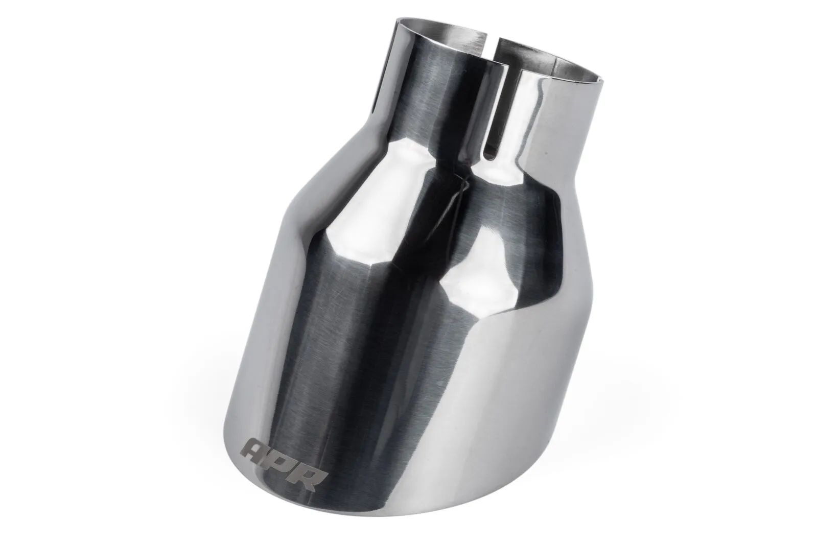 Our polished slash-cut single-walled 4" exhaust tips upgrade the rear of the vehicle dramatically. The motorsport-inspired tips tuck nicely into the factory valance, gently following the valance's curves and demanding all the right attention in all the right places. Each tip features a laser etched APR logo. Each kit is sold as a set of two tips.