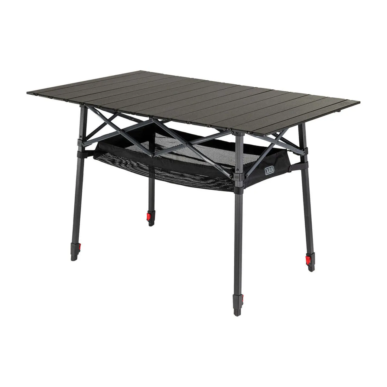 The ARB Pinnacle Camp Table is perfect for cooking and eating on the move. Its durable frame is made from black aluminum with contrasting charcoal crossbars. The generously sized, black, rugged tabletop provides ample space for mealtime or game night. Each leg can be independently adjusted to allow for stability on uneven surfaces, and the table height can be adjusted anywhere from 31 to 39 inches. The built-in brackets on the frame hold the included mesh basket for added storage. The table packs into a compact 600D polyester carry bag featuring a built-in internal divider to separate the tabletop from the frame.
