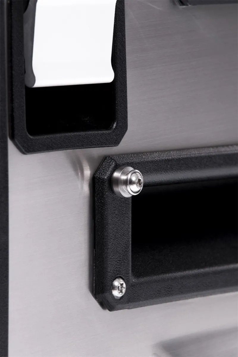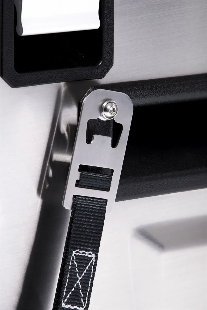 For semi-permanent or temporary securing of the Elements Fridge Freezer, a new tie down system has been developed. The system incorporates unique replacement fridge handle fasteners to accept the stainless steel strap brackets that also double up as a convenient bottle opener. Lower brackets can be directly mounted to provisions on the Elements Fridge Slide or to any other hard surface. Another handy addition is the power cable retention buckle that keeps cords away from moving parts to avoid damage.