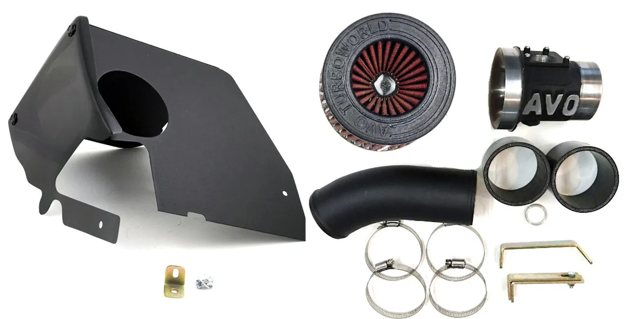The AVO Power Intake Air Box combo includes all the mounting brackets and 2 silicone hoses with a 45 degree connecting pipe, dry style air filter and air box.