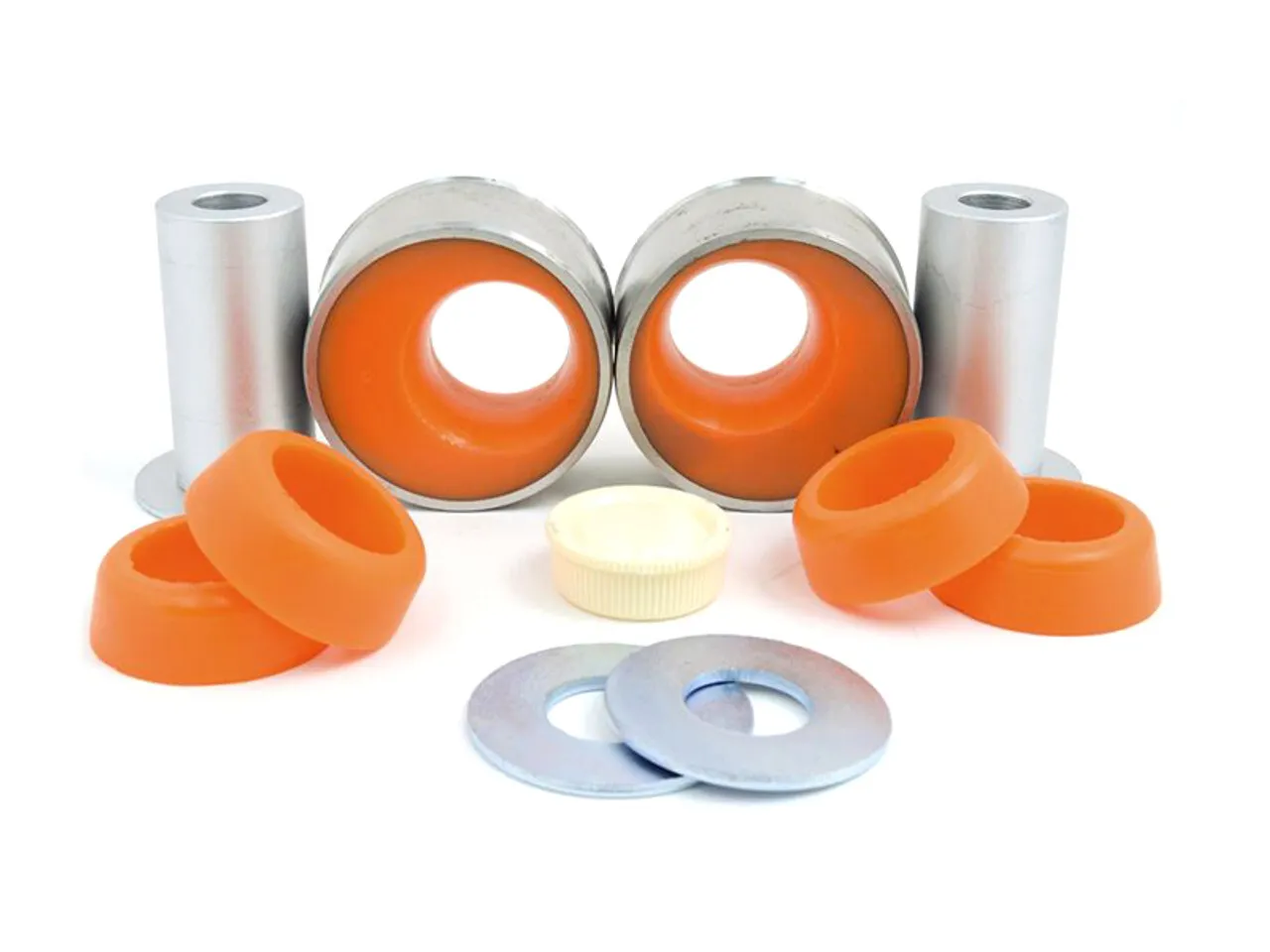 You may have noticed that you have to constantly correct the steering mid corner - this is the reason why. When you hit a bump, the front suspension responds to the impact by pushing the lower control arm backwards and up. Due to the independent design of the front suspension, this leads to the front tyres having different toe angles while responding to that bump. This also places a lot of pressure on the rear bushing, which is why our design incorporates a lip at the top to keep it from popping out of the lower control arm. These bushings replace the large rear bushing on the control arm, firming it up without adding too much NVH. These bushings come in two flavors, +0.05 offset and standard. The offset Caster Adjustment Bushing system does just that, increases the caster. The additional caster improves turn in when cornering, plus improves straight line stability.