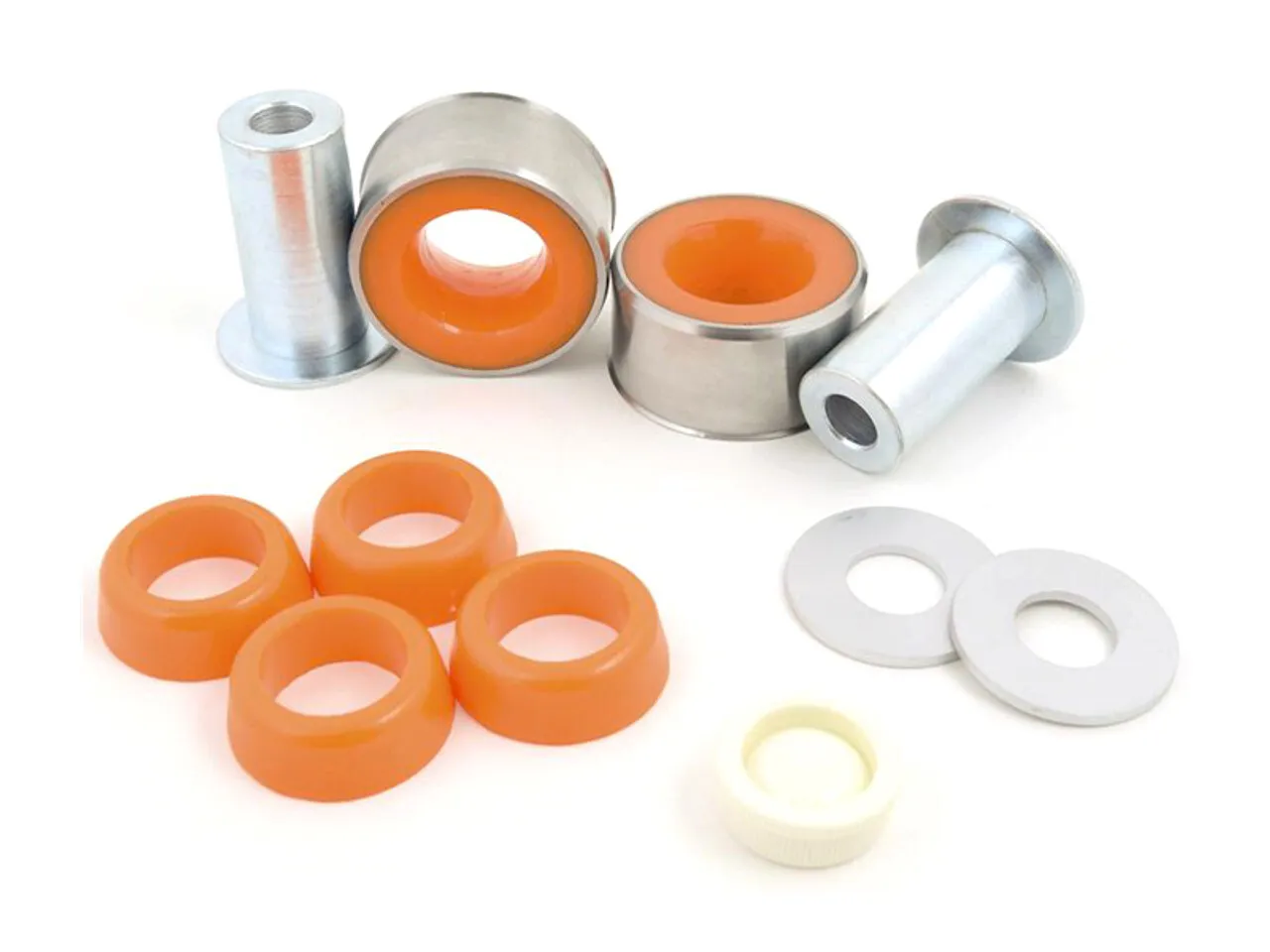 You may have noticed that you have to constantly correct the steering mid corner - this is the reason why. When you hit a bump, the front suspension responds to the impact by pushing the lower control arm backwards and up. Due to the independent design of the front suspension, this leads to the front tyres having different toe angles while responding to that bump. This also places a lot of pressure on the rear bushing, which is why our design incorporates a lip at the top to keep it from popping out of the lower control arm. These bushings replace the large rear bushing on the control arm, firming it up without adding too much NVH. These bushings come in two flavors, +0.05 offset and standard. The offset Caster Adjustment Bushing system does just that, increases the caster. The additional caster improves turn in when cornering, plus improves straight line stability.