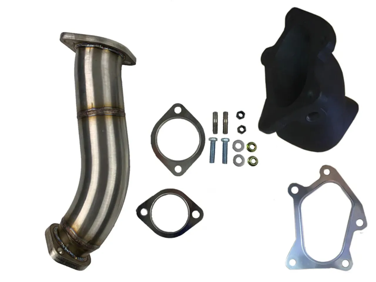 AVO's Catless Front Pipe bolts to the front half of the factory front pipe by way of a reduction in the 3" to a 2 1/2" flange. The stainless flanges are a lost wax stainless casting that are 13mm thick and will not warp under the harshest of conditions. The thickness of our exhaust tube is 1.5mm which is thicker than most aftermarket front pipes. This helps with noise absorption and with longevity of the product.