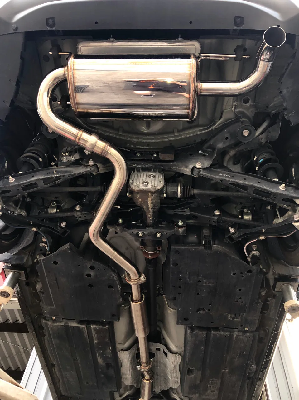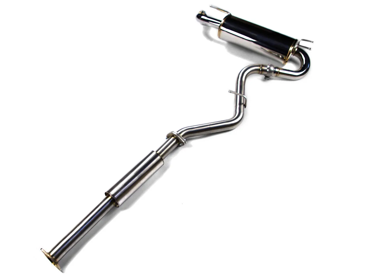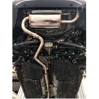 The AVO cat back has a tapered flange at the front so that it can fit a standard OEM front pipe or AVO front pipe with a donut gasket setup. This will ensure the flex in the system still operates as it was intended to from factory.