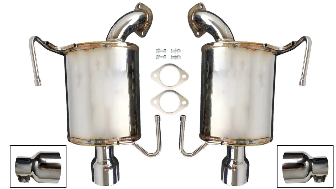 The twin mufflers are constructed fully of stainless steel with 63mm (2.5") piping from the y-pipe. The dual mufflers give a great sound out the rear with the AVO 4" round-rolled adjustable exhaust tips. The front section of the cat back is 3" with a resonator, which then runs into a y-section that is twin 2 1/2".