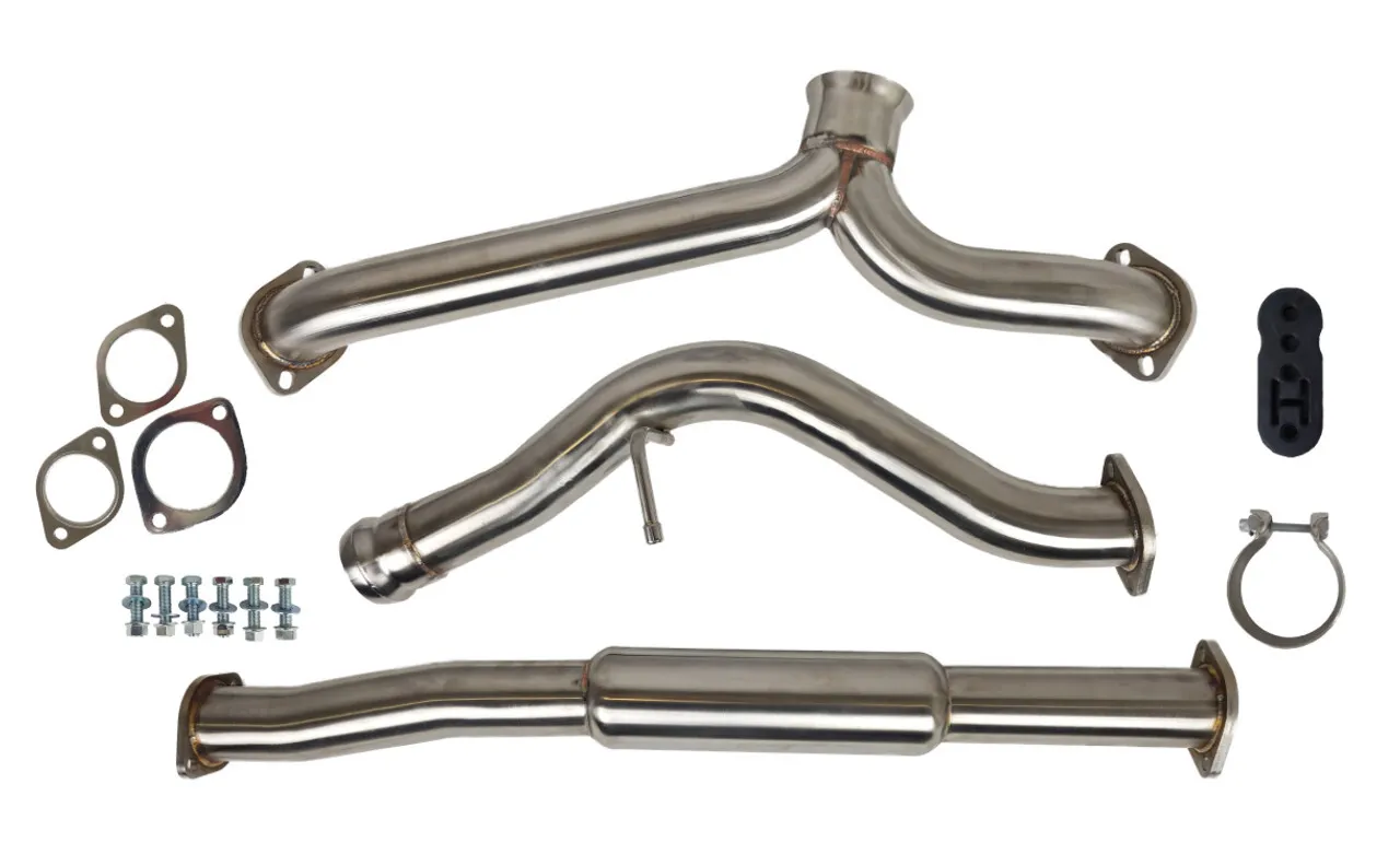The AVO cat back has a tapered flange at the front so that it can fit a standard OEM front pipe with a donut gasket setup. This will ensure the flex in the system still operates as it was intended to from factory. The Y-Pipe has an adjustable coupling with a clamp to allow for ease of fitment.