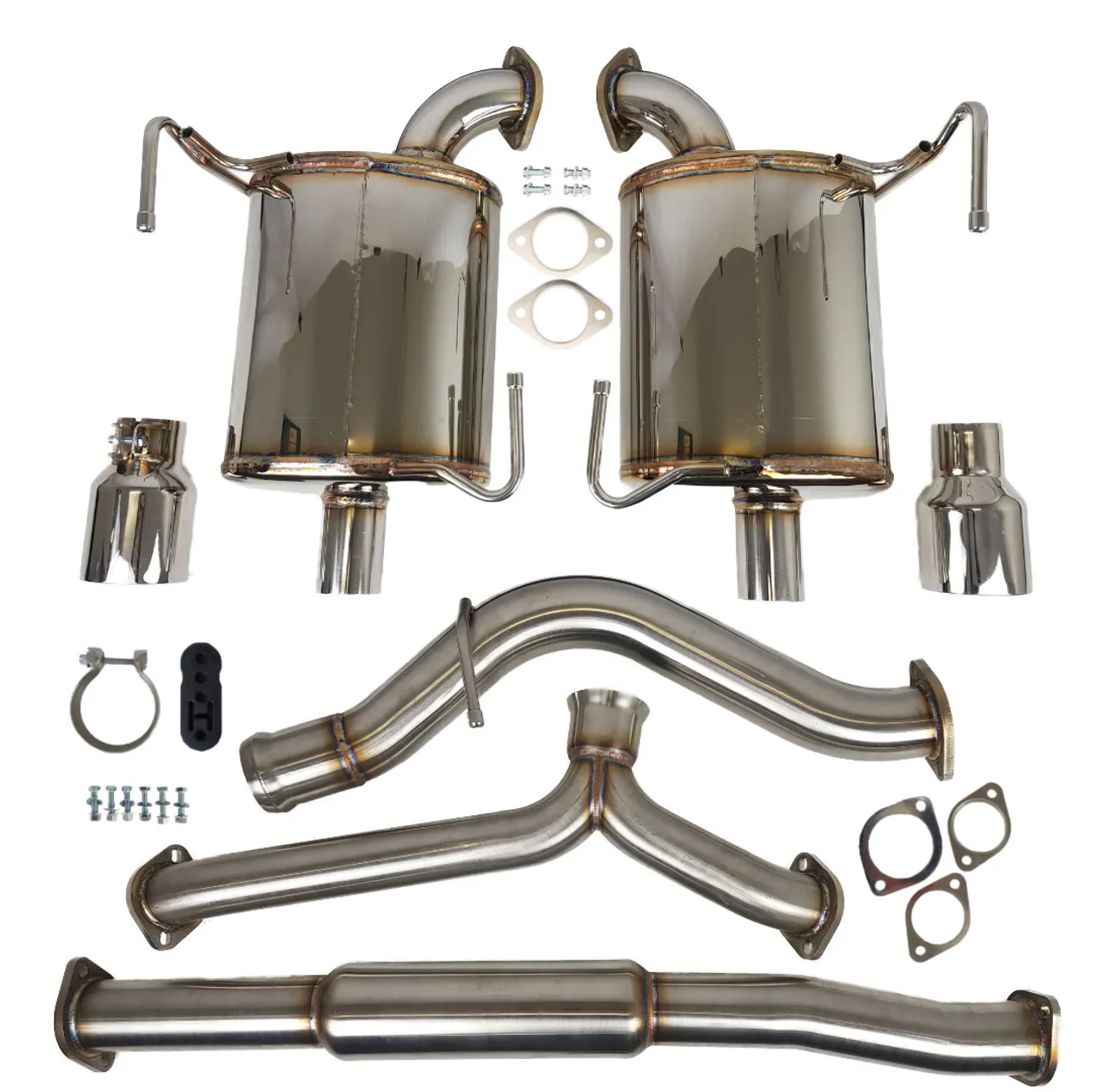 The AVO cat back has a tapered flange at the front so that it can fit a standard OEM front pipe with a donut gasket setup. This will ensure the flex in the system still operates as it was intended to from factory. The Y-Pipe has an adjustable coupling with a clamp to allow for ease of fitment.