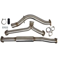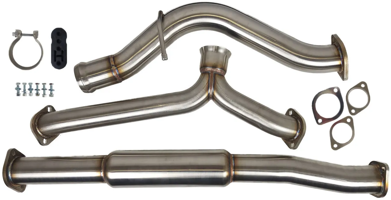 The AVO centre pipe kit has a tapered flange at the front so that it can fit a standard OEM front pipe with a donut gasket setup. This will ensure the flex in the system still operates as it was intended to from factory. The Y-Pipe has an adjustable coupling with a clamp to allow for ease of fitment.