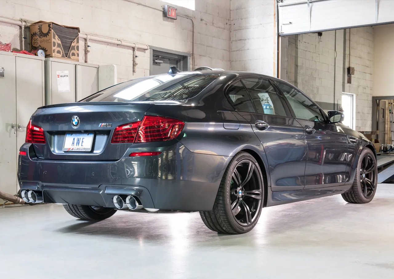 Perfect Sound. Perfect Power. The AWE BMW F10 M5 Touring Edition Exhaust is the ultimate compliment to BMW’s flagship sport sedan.The F10 M5 needed its V8 soundtrack unlocked, and a notable kick in horsepower wouldn't be a bad thing either. The most straightforward way to accomplish this goal was by deploying a 180 Technology®-armed Axleback configuration. The result? A system that is both comfortable on the highway at cruising speeds, and aggressive when you're ready to drop the hammer. The AWE BMW F10 M5 Exhaust Suite is available in two tip color choices, our signature chrome silver, or diamond black. All tips for the M5 are 102mm, filling the rear valance for more muscular styling.