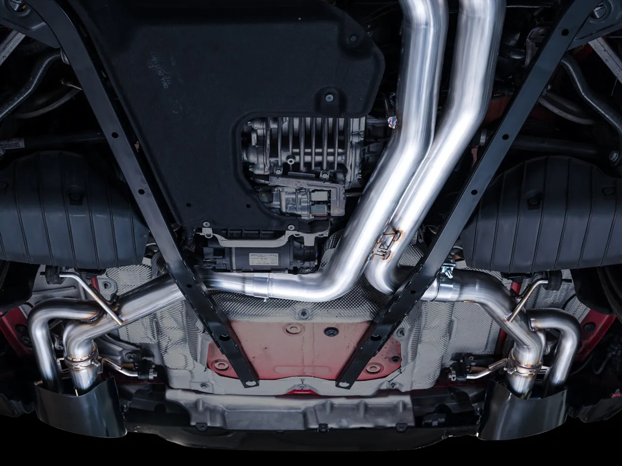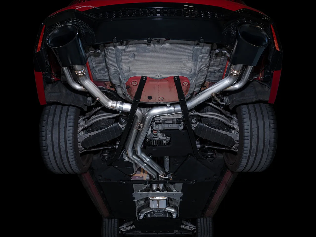 What’s in the box? Complete AWE SwitchPath™ Exhaust, two AWE parabolic tips in diamond black, two valve extension harnesses, and all required hardware and bracketry for installation.