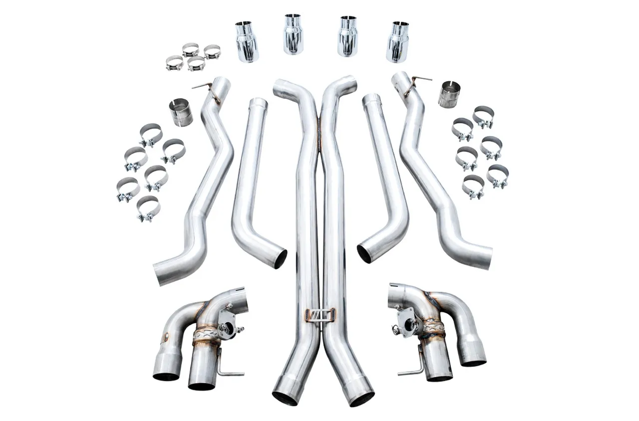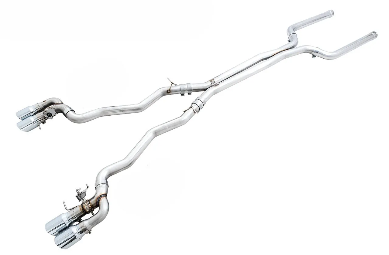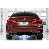 The SwitchPath™ Cat Back Exhaust features dual 3” CNC mandrel-bent .065” wall T304L stainless steel tubing from downpipes to tip outlets with a precision-engineered X-pipe in between. Equipped with valved rear sections, the SwitchPath™ Cat Back retains all of the M5’s valve behavior when changing driving modes and/or using the exhaust button found on the console. The AWE Performance Mid Pipes replace the factory mid section with a 3” stainless steel X-pipe, and are included in the Cat Back SwitchPath™ configuration. All tip options are 4", slash-cut, and include the AWE logo and double-walling to ensure a mirror finish even under hard usage. All tips are individually adjustable, allowing depth into the bumper to be set according to personal taste.