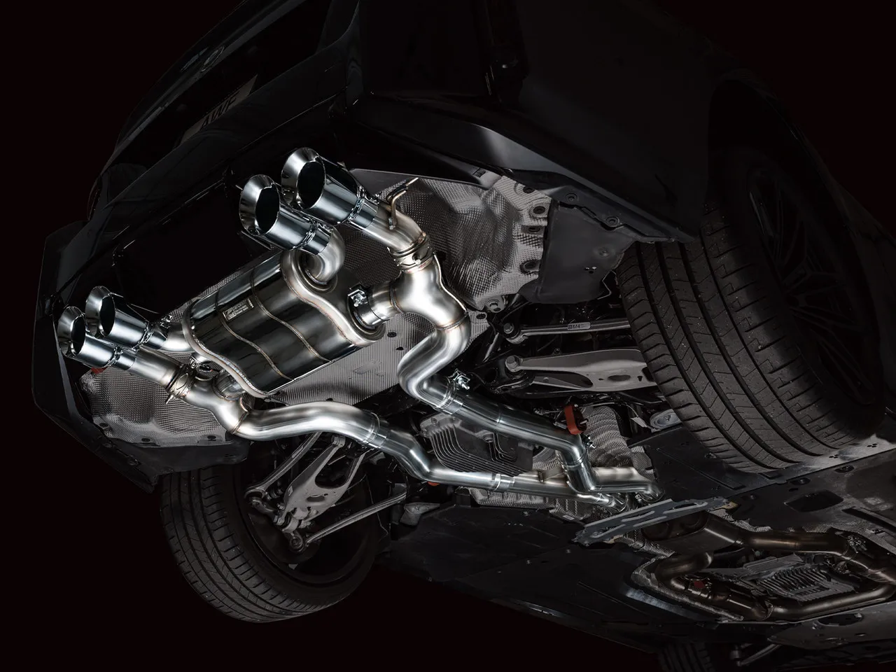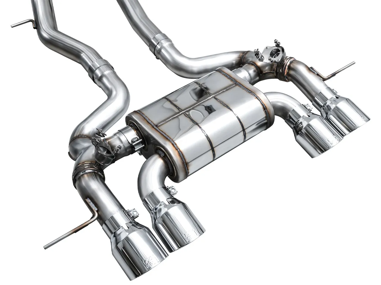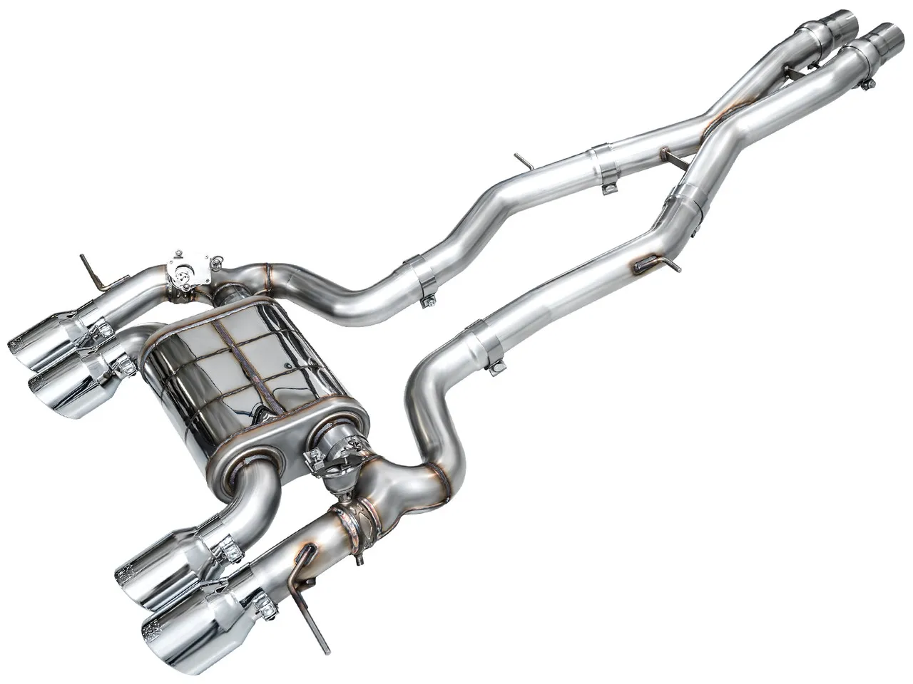 The AWE SwitchPath™ Exhaust is comprised of 3-inch U.S.-sourced T304L stainless steel, a precision x-pipe, and a valved SwitchPath™ muffler tuned for the S58. Beginning after the factory mid pipe, the precision X-pipe immediately cures the S58 of its rasp, deepening the tone before it's refined further by the bespoke SwitchPath™ muffler. When the valves are closed, the SwitchPath™ produces a refined, aggressive howl while remaining full-bodied and powerful – no congested, metallic sounds when you're on it. At cruising, interior acoustics are close to stock with no drone. AWE SwitchPath™ tech responds perfectly to the many transmission settings and shift points of the G87. Drop the hammer with the valves closed and SwitchPath™ sings a proper M anthem. If you were to leave the valves closed at all times after equipping SwitchPath™, we wouldn’t blame you — it’s that good… all of the time. Open the valves and the S58’s roar is uncorked. Sport and Sport+ modes achieve the ultimate contrast in behavior when compared to comfort driving modes (aka valves closed). In Sport mode, the exhaust note is powerful, clean, and aggressive. In Sport+ mode, the same aggression applies… but with grin-provoking burbles. Thanks to the precision X-pipe, the rasp is still kept in check while allowing the exhaust note to reach full aggression. The AWE SwitchPath™ comes with quad 4.5” double-walled, slash-cut tips available in chrome silver or diamond black. The exhaust also features inlet adapters to mate to the factory mid-section. When pairing AWE Mid-Pipes to the SwitchPath™ or Track Edition Exhausts, these adapters are not needed. Due to varying cut points, AWE Exhausts are not guaranteed to mate with another manufacturer’s mid pipes. AWE's No CEL Guarantee, Perfect Fitment Guarantee, and Lifetime Warranty come standard.