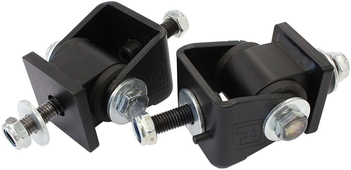 Aeroflow Performance engine mounts are a great upgrade for your daily driver, high performance or competition car. Be sure the engine sits in the right place every time with these engine mounts that are designed as a direct bolt up for conversion cars and also OEM replacement with no extra adapters required. Due to excessive movement the factory OE engine mounts are prone to failure or just everyday wear and tear. The black polyurethane bushes and high-quality steel mounts isolates the engine from the chassis, resulting in vibration suppression and allowing the power to get to the ground where it is needed. The two-piece bolt together design of these engine mounts allow the end user to split the two halves for ease of removal or installation of the engine to the chassis.