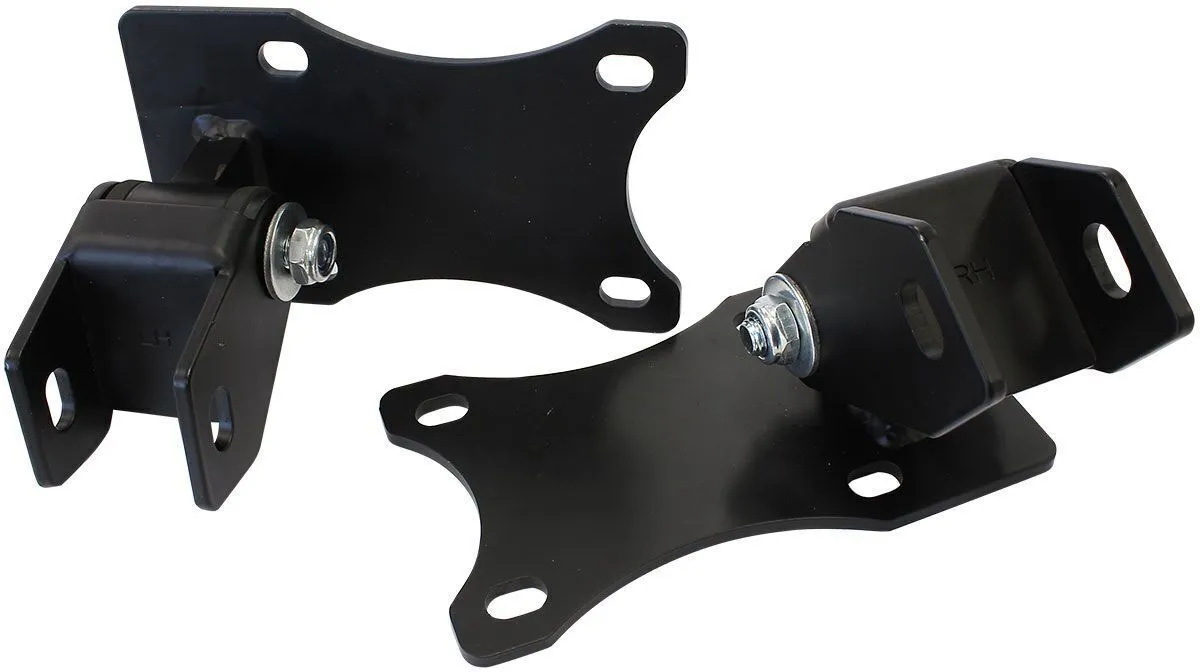 Aeroflow Performance engine mounts are a great upgrade for your daily driver, high performance or competition car. Be sure the engine sits in the right place every time with these engine mounts that are designed as a direct bolt up for conversion cars and also OEM replacement with no extra adapters required. Due to excessive movement the factory OE engine mounts are prone to failure or just everyday wear and tear. The black polyurethane bushes and high-quality steel mounts isolates the engine from the chassis, resulting in vibration suppression and allowing the power to get to the ground where it is needed. The two-piece bolt together design of these engine mounts allow the end user to split the two halves for ease of removal or installation of the engine to the chassis.