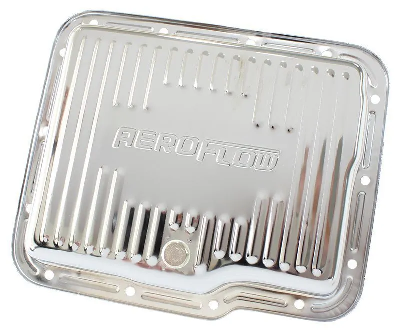 These Aeroflow transmission pans add a little zing to the undercarriage of any vehicle. The included drain plug makes transmission service a snap. These pans are thicker than stock so you don’t have to worry about leaky pan rails. Available in two great finishes; chrome plated and black electrolysis.