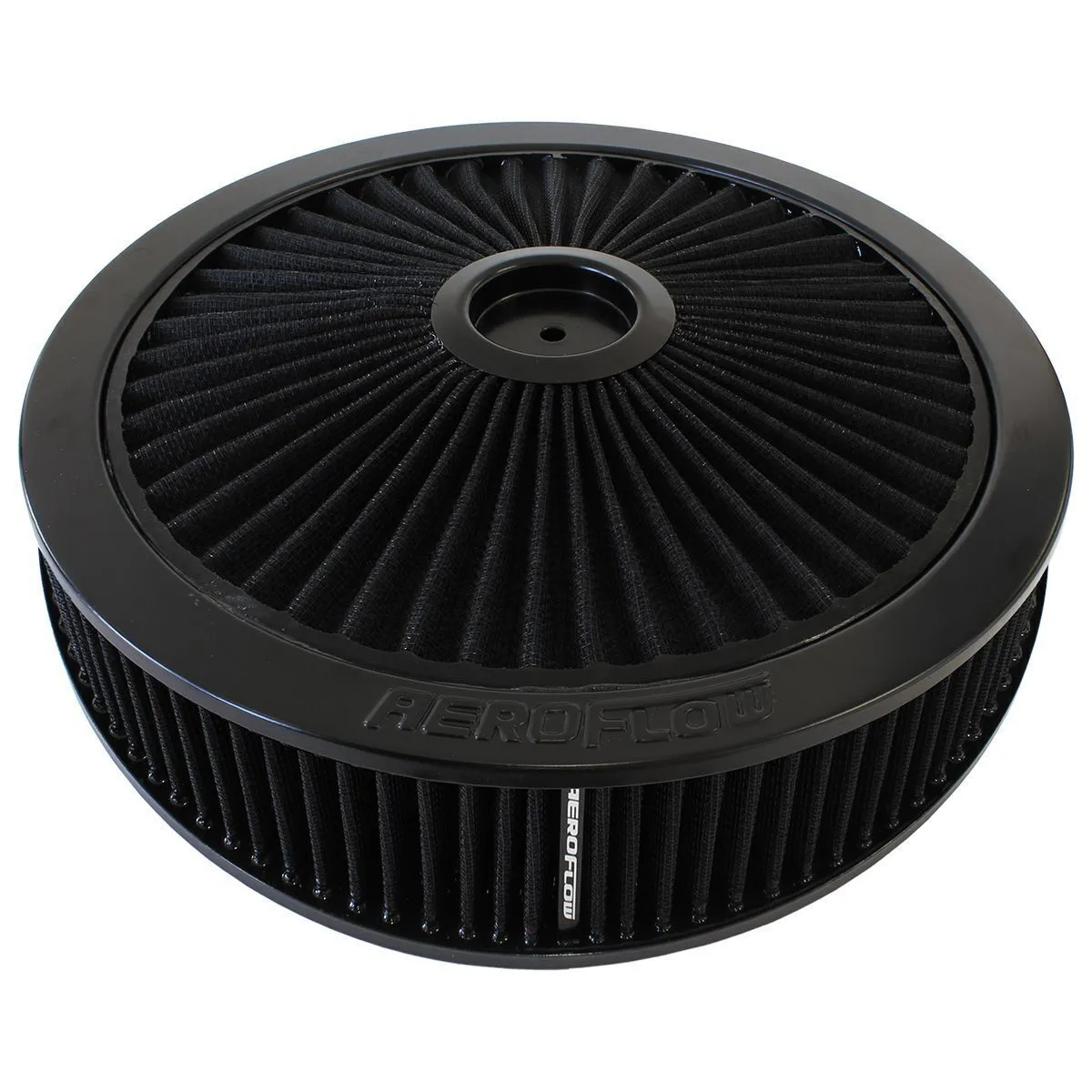 Stand out from the crowd with a magnificent looking Aeroflow air cleaner. These air cleaners are stamped from high quality steel. Available in many different great finishes and styles for that custom look you are after. Chrome-plated or black finish with reusable/washable or paper elements. Aeroflow air filter assemblies work with all popular standard 4150 (5-1/8"" / 130mm) carburettors and 4500 Dominator (7-5/16"" /186mm) carburettors. The 14"" (355.60mm) air filter assemblies come with a drop base that sits 1-1/8"" (28mm) below the carburettor.