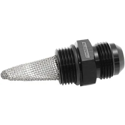 Aeroflow oil system filter screen fittings have a built-in oil screen filter within the aluminium fitting. This filter screen is designedto stop metal chips and debrisfrom reaching external or dry sump oil systems. The filter screen itself is made from 304stainless steel. It uses .015" diameter 16 mesh wire which is course enough toallow thick engine oil throughwith minimal restriction. We recommend to remove this fitting and inspect/clean out the screen every oil change.