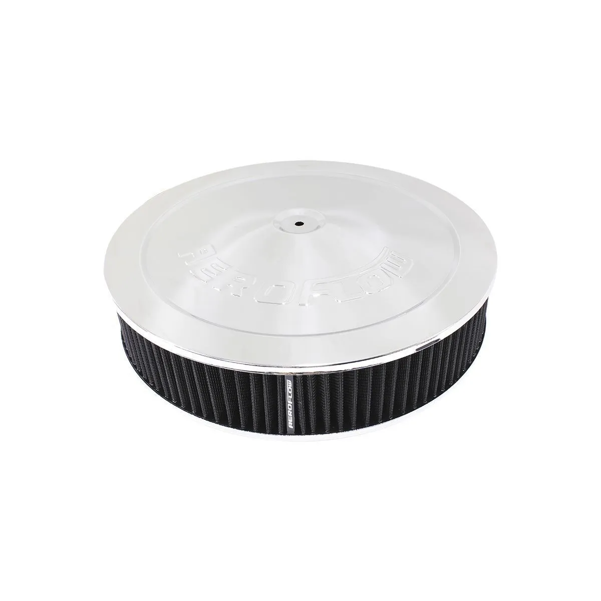 Stand out from the crowd with a magnificent looking Aeroflow air cleaner. These air cleaners are stamped from high quality steel. Available in many different great finishes and styles for that custom look you are after. Chrome-plated or black finish with reusable/washable or paper elements. Aeroflow air filter assemblies work with all popular standard 4150 (5-1/8"" / 130mm) carburettors and 4500 Dominator (7-5/16"" /186mm) carburettors. The 14"" (355.60mm) air filter assemblies come with a drop base that sits 1-1/8"" (28mm) below the carburettor.