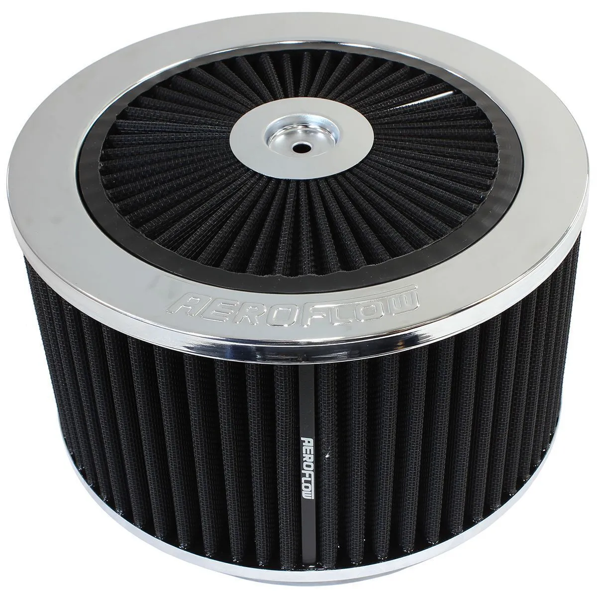 Stand out from the crowd with a magnificent looking Aeroflow air cleaner. These air cleaners are stamped from high quality steel. Available in many different great finishes and styles for that custom look you are after. Chrome-plated or black finish with reusable/washable or paper elements. Aeroflow air filter assemblies work with all popular standard 4150 (5-1/8" / 130mm) carburettors and 4500 Dominator (7-5/16"" /186mm) carburettors. The 14" (355.60mm) air filter assemblies come with a drop base that sits 1-1/8" (28mm) below the carburettor.