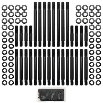 These head studs are manufactured from aircraftquality 8740 high tensile strength chromoly steel and cold-forged to ensure molecular integrity within thestud. Meaning these studs are rated up to 190,000 psi makingthem stronger than Grade 8 andOEM fasteners. All kits come complete with 12-point nuts and hardened washers for an even load distribution and accurate torque readings.
