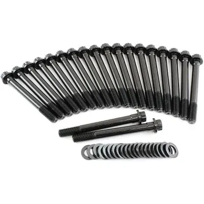These head bolts are manufactured from aircraft quality 8740 high tensile strength chromolysteel and cold-forged to ensure molecular integrity within the bolt. Meaning thesebolts are rated up to 190,000 psi making them stronger than Grade 8 and OEM fasteners. Allkits come complete with hardened parallel washers for an even load distribution and accurate torque readings.