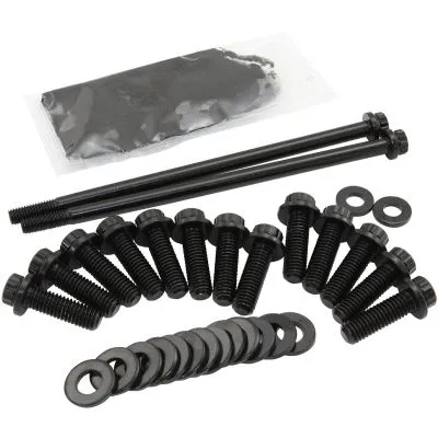 These oil pan bolts are manufactured from aircraft quality 8740 high tensile strength chromolysteel and cold-forged to ensure molecular integrity within the stud. All bolts feature a small 12-point head and hardened parallel washers for an even load distribution and accurate torque readings.