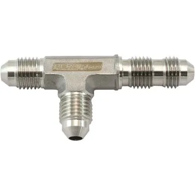These Tee-Piece AN bulkhead fittingsallow you to easily and safelyrun you fuel/oil/water lines through a panel or firewall without worrying about rubber grommets and wearing through the hose. Available with -3 or-4 AN male.