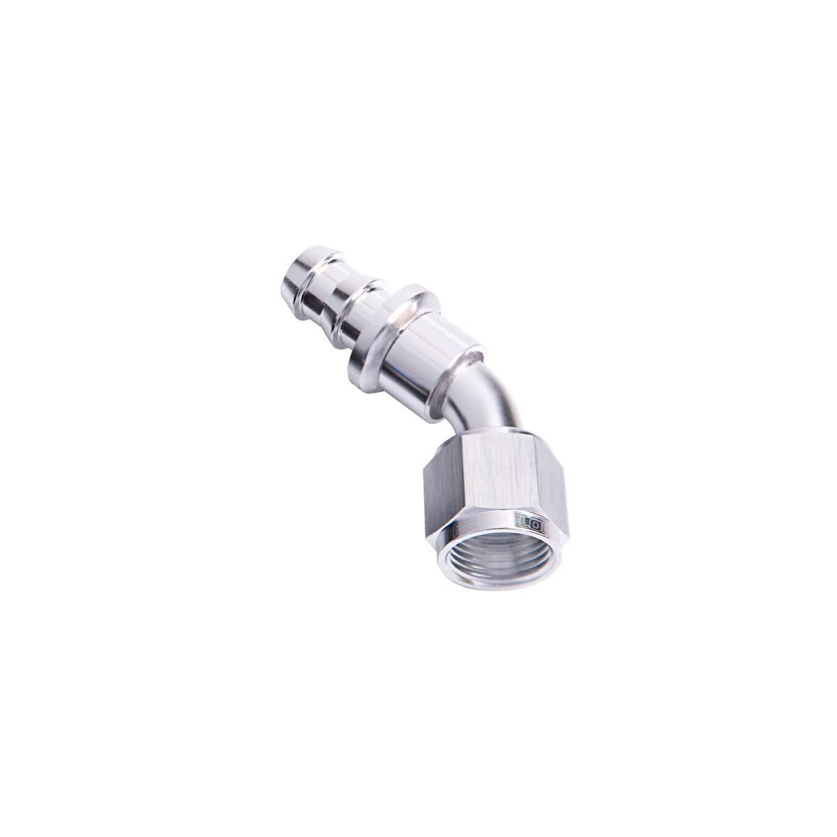 Aeroflow's 400 series push lock fittings are a mandrel bent braised full flow fitting with a custom designed barbed end to allow a quick, easy and leak free assembly. Aeroflow's push lock fittings come with a purpose designed cover to hide the messy cut end of the hose to give you that professional look everytime. Compatible Hose: 400 and 500 Series Push Lock hose (Blue and Black).