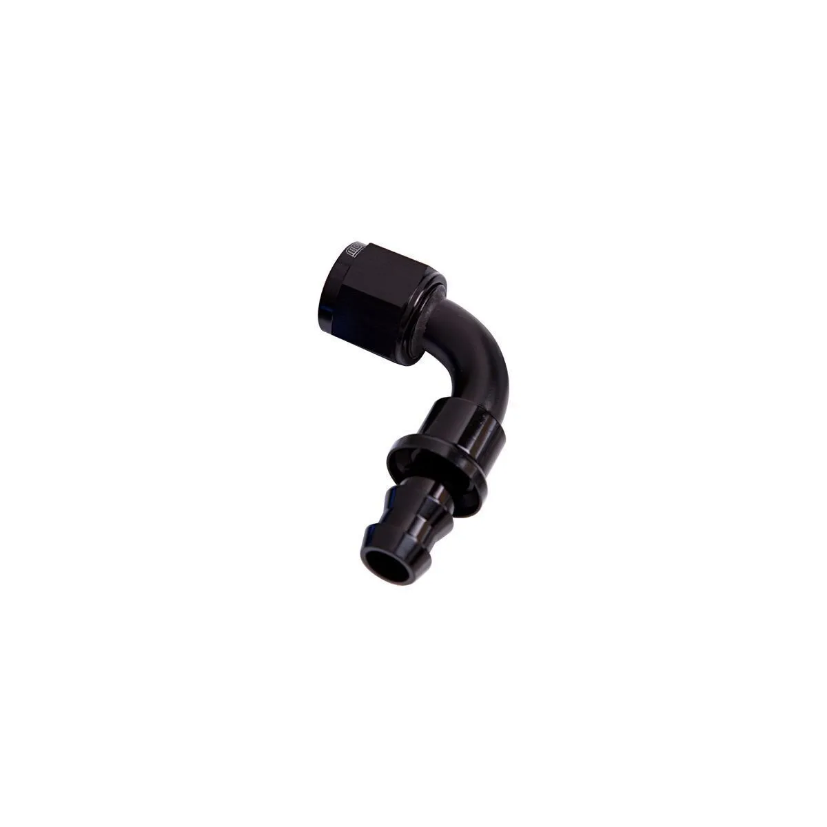 Aeroflow's 400 series push lock fittings are a mandrel bent braised full flow fitting with a custom designed barbed end to allow a quick, easy and leak free assembly. Aeroflow's push lock fittings come with a purpose designed cover to hide the messy cut end of the hose to give you that professional look everytime. Compatible Hose: 400 and 500 Series Push Lock hose (Blue and Black).