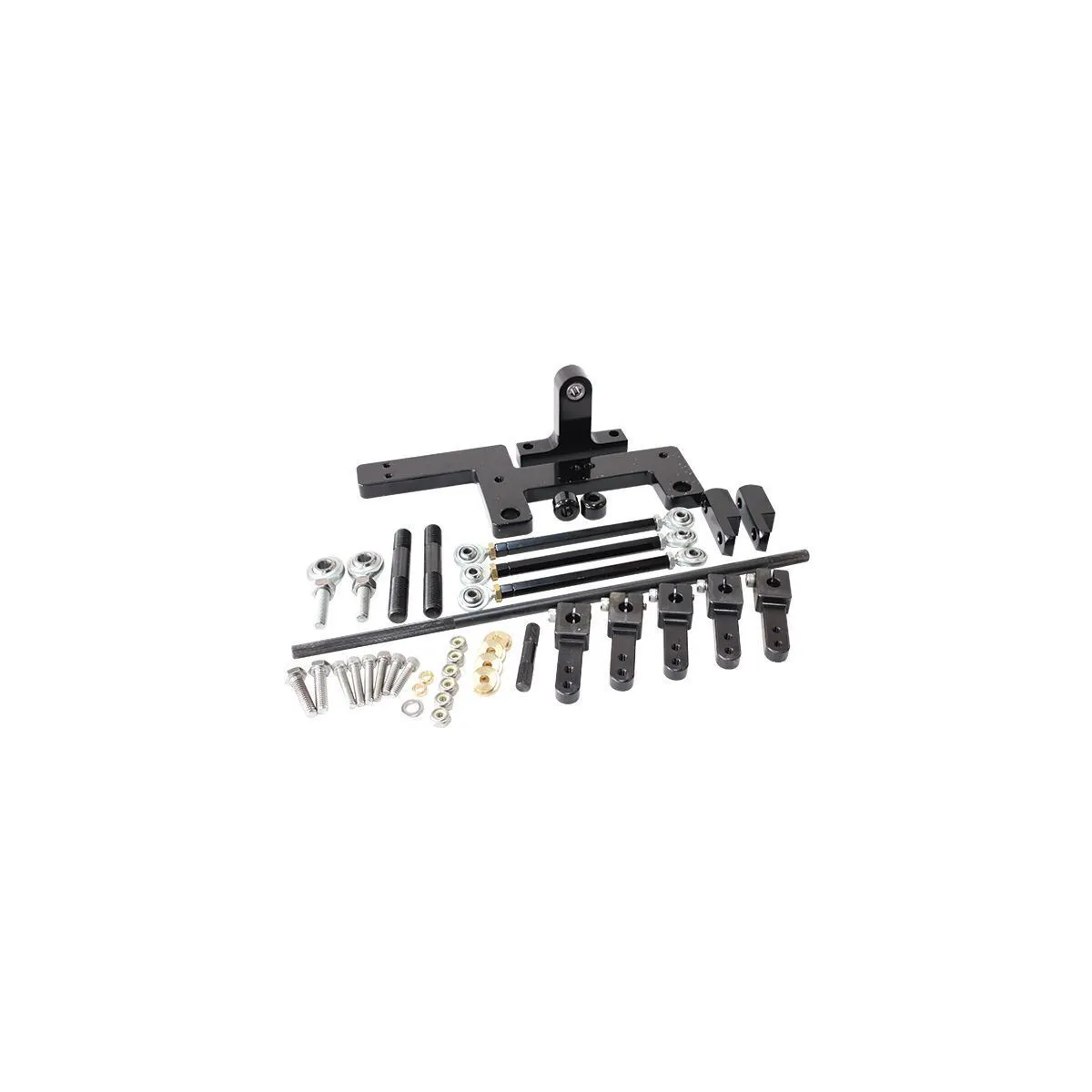 This dual carb linkage kit is designed for use on dual 4150 Series carburettors (non-dominator) mounted sideways on top of a blower. AF42-1070 has high quality chrome elite finish and AF42-1070BLK hand polished black anodised finished. Features adjustable heim end design and needle bearings for longevity and smooth throttle operation. Shafts and arms are splined to avert slipping. Two extra-long studs are included to mount the lower cable bracket to the left side of blower.
