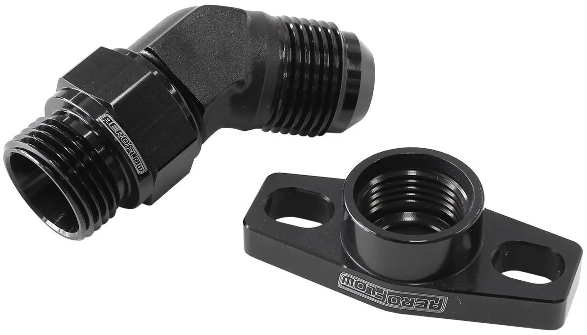 This selection of turbo drains options available from Aeroflow Performance will allow a large range custom plumbing application. For sufficient drainage of oil for both bearing styles of turbochargers a -10AN or 5/8” hose is ideal. The oil outlet should follow the direction of gravity +/-45° when installed in the vehicle on level ground. It is recommended to avoid kinks or beyond 90-degree bends in the oil drain line and draining into the sump below. With heat surrounding the manifold and turbocharger a heat shield or sleeve is a great idea to prolong the life of the hose.