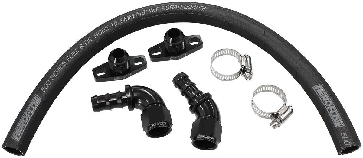 Aeroflow Performance Ford XR6 turbo oil drain kit is the perfect solution to easily run your factory or aftermarket turbochargers oil return line. These -10AN Oil Line Kits include a 500mm length of 500 series push lock hose and the necessary fittings and flanges to get the turbo drain hose plumbed. Includes Aeroflow 510 series AN Fittings (one 90° hose end, one 45° hose end), two aluminium oil drain flanges (to suit both the engine block and factory turbo).